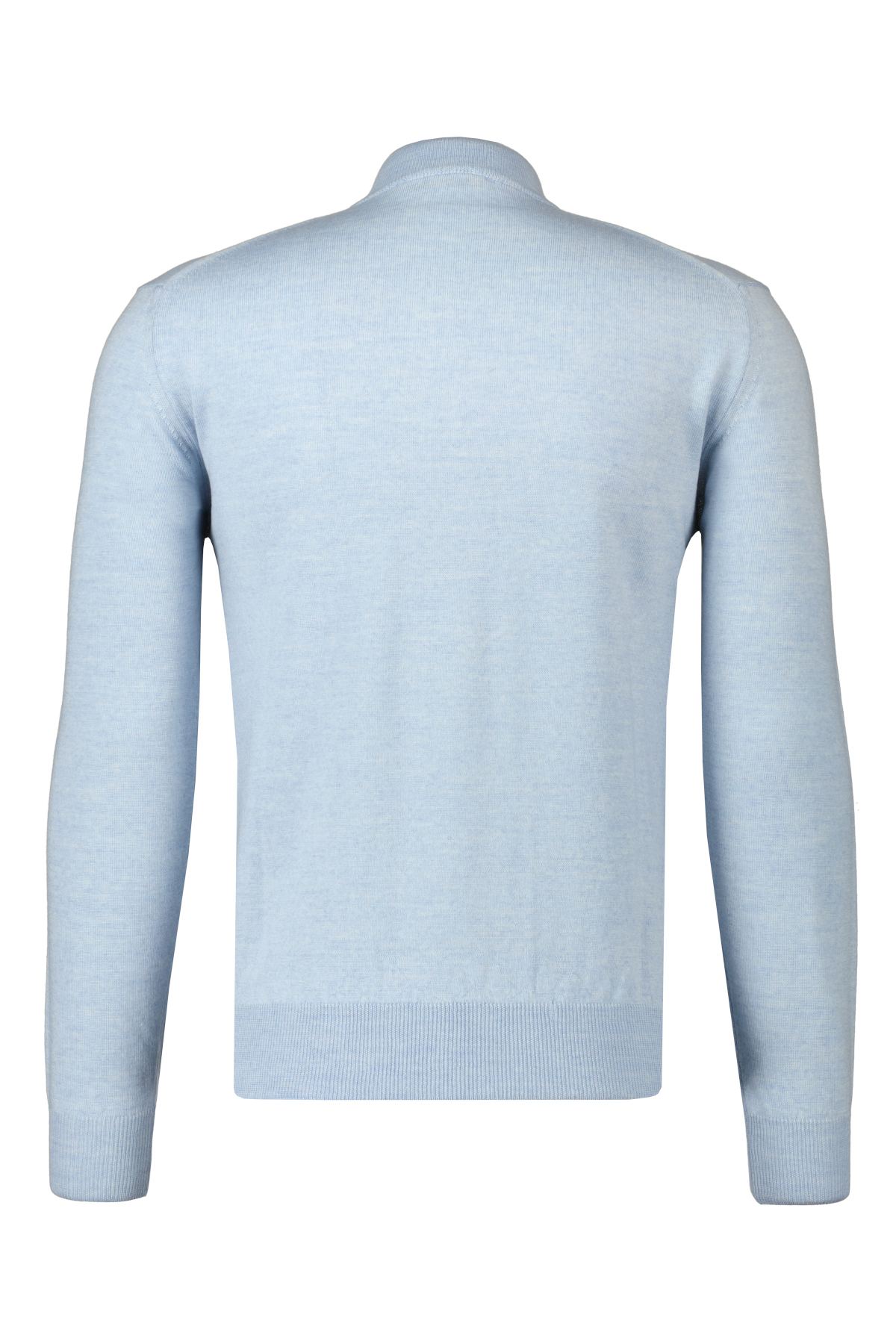 Lichtblauwe wollen trui met rits voor heren van Aurélien. Zo zacht als Cashmere met een zijde glans. Deze trui is handgemaakt in Italië van het ultra luxe Cashwool ®.