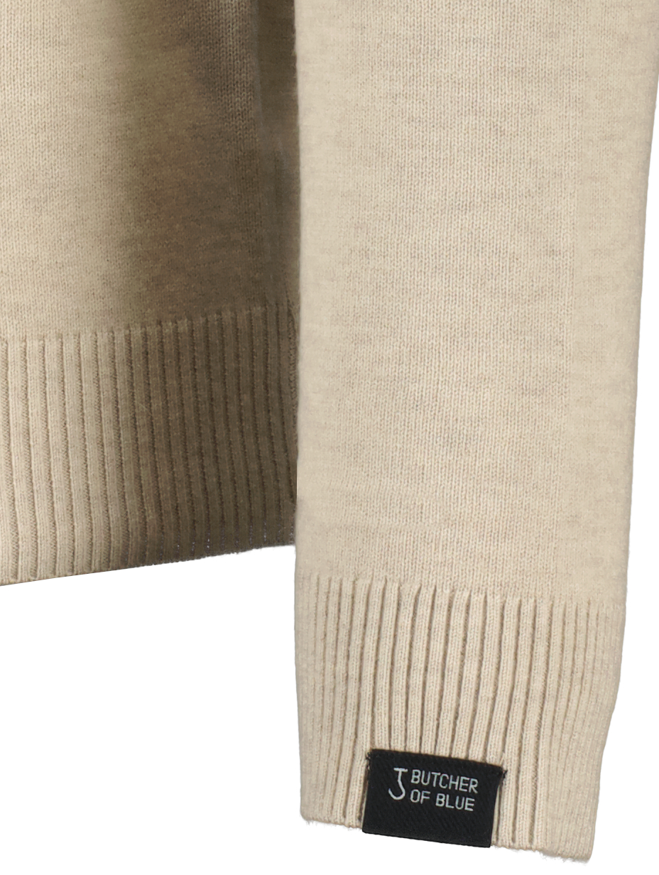 Beige trui voor heren model Clifden Mock van Butcher of Blue. Deze trui heeft een grof geribde mockneck, geribde manchetten en onderband, heeft een ton-sur-ton logobadge op de linkerborst, een subtiel logo label op de linkermouw en komt in regular fit.