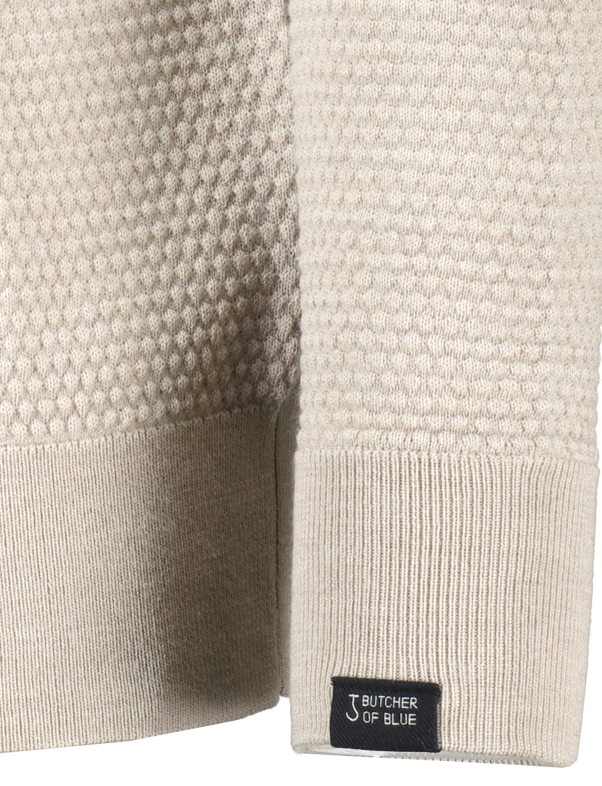 Beige half-zip trui voor heren model Structure Halfzip van Butcher of Blue. De Structure heeft een bolletjespatroon in de stof, heeft licht geribde hals, manchetten en onderband, heeft een logobadge op de linkerborst, een subtiel logo label op de linkermouw en valt regular fit.