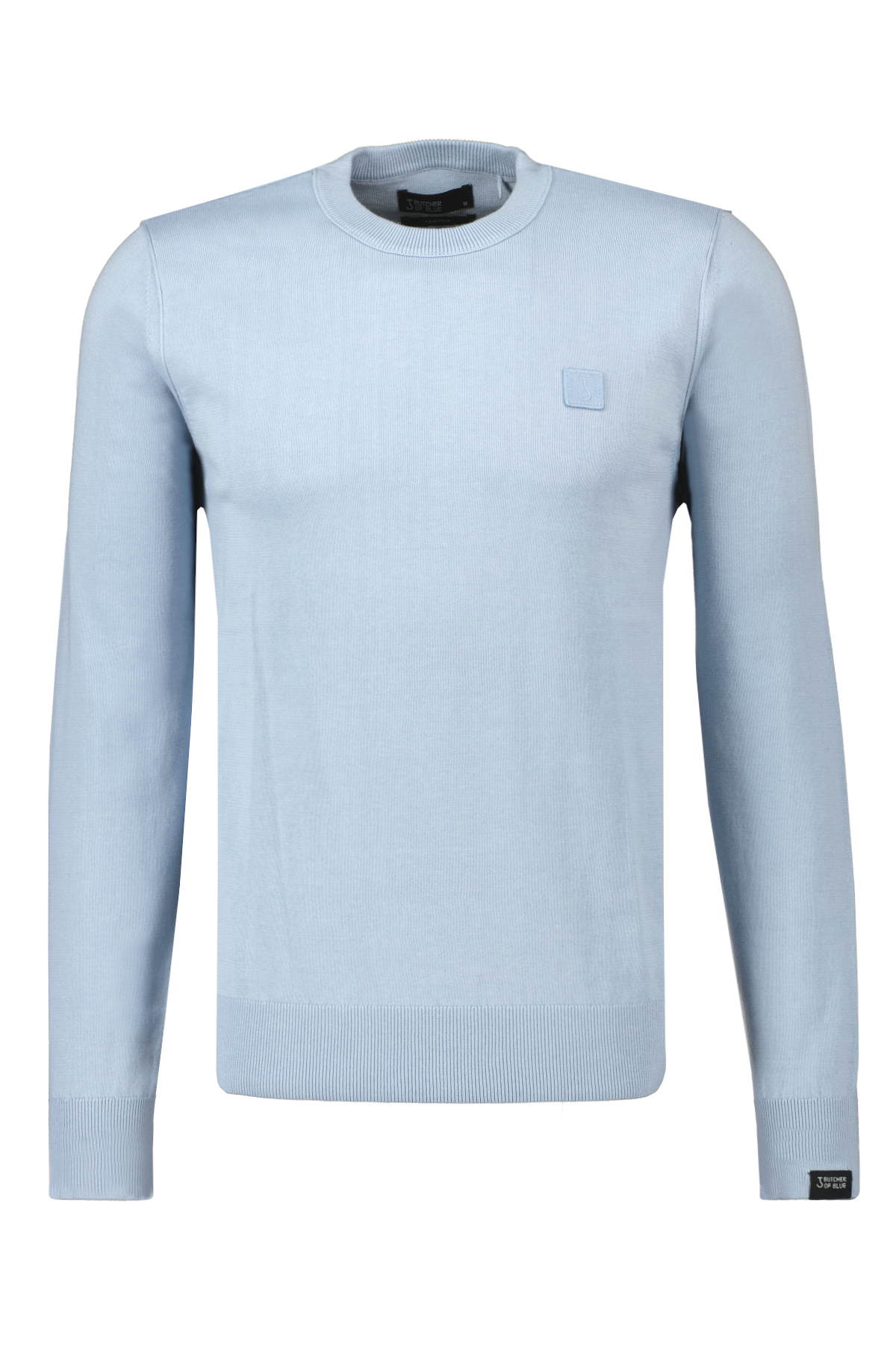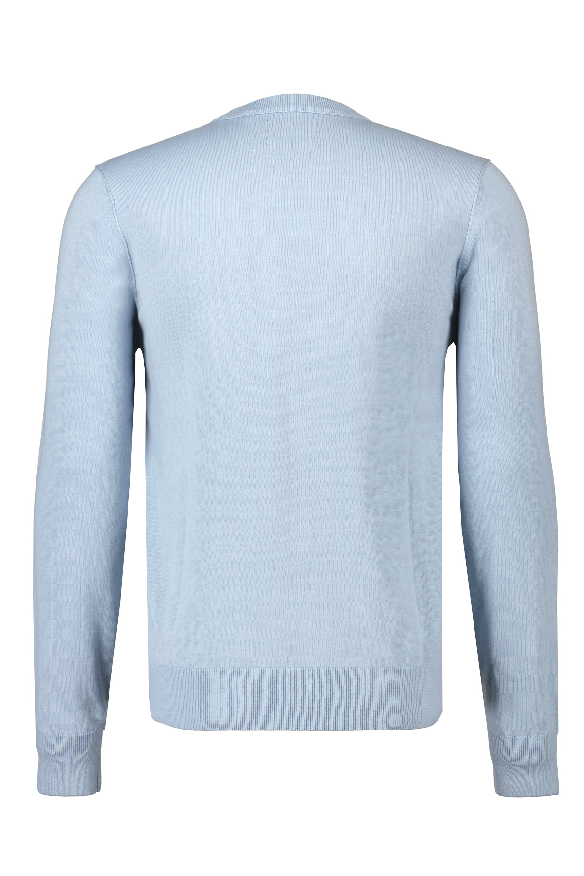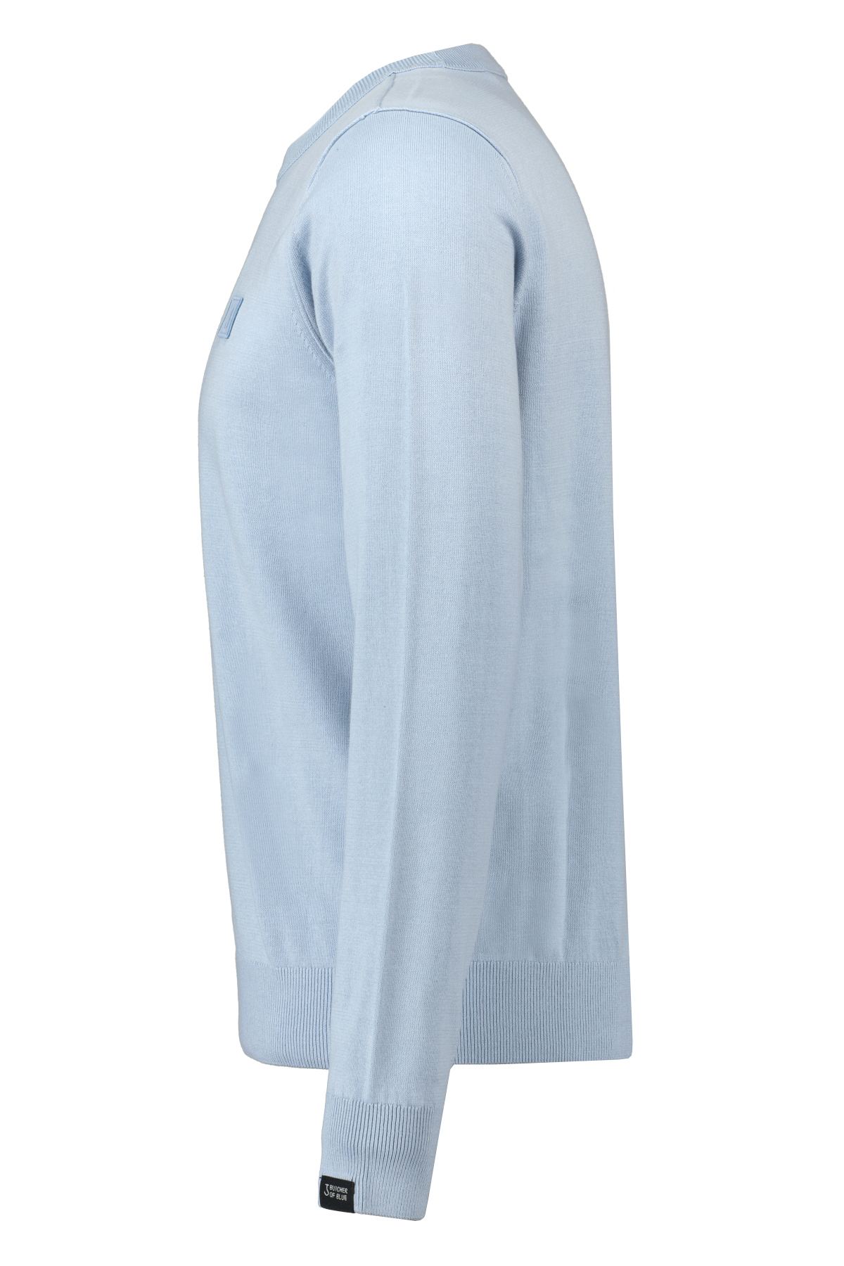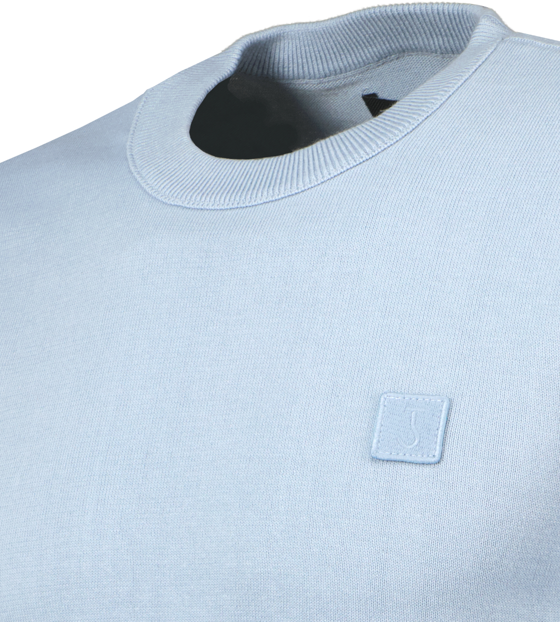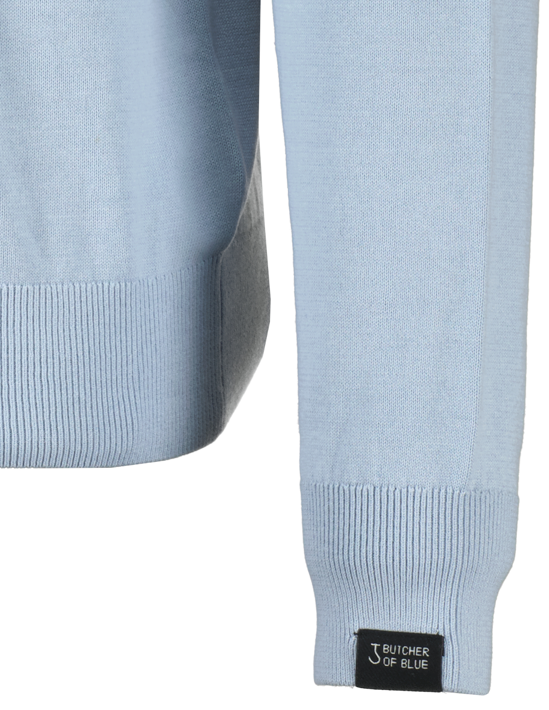 Lichtblauwe trui voor heren model Clifden Crew van Butcher of Blue. De trui is gemaakt van organisch katoen, heeft een ronde hals die mooi aangesloten zit en unieke details als de herkenbare naden op de schouder en de ton-sur-ton logopatch op de linkerborst.