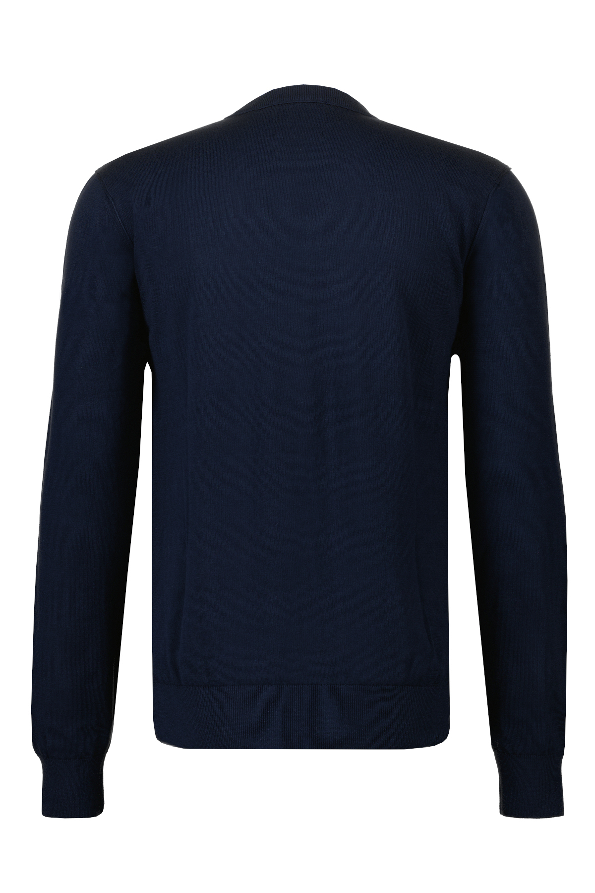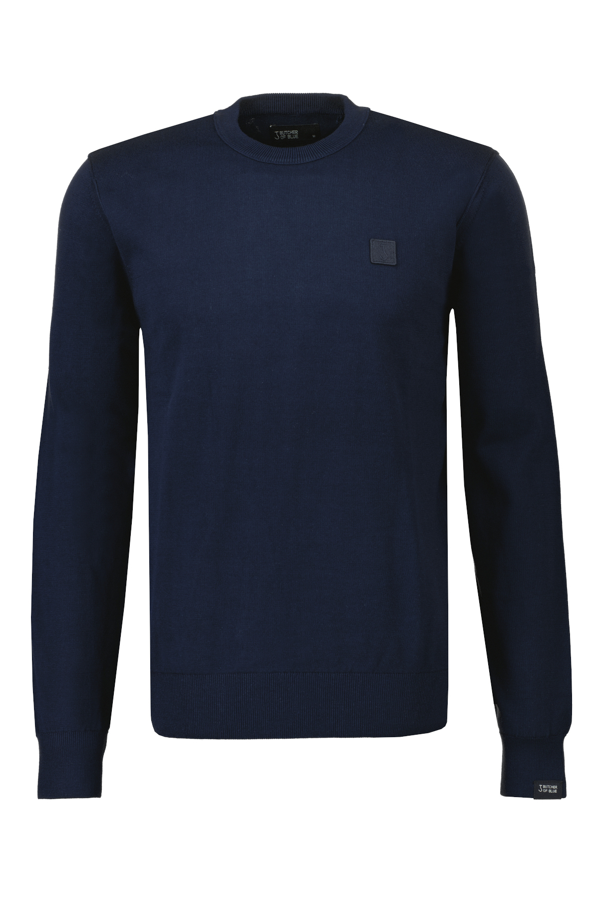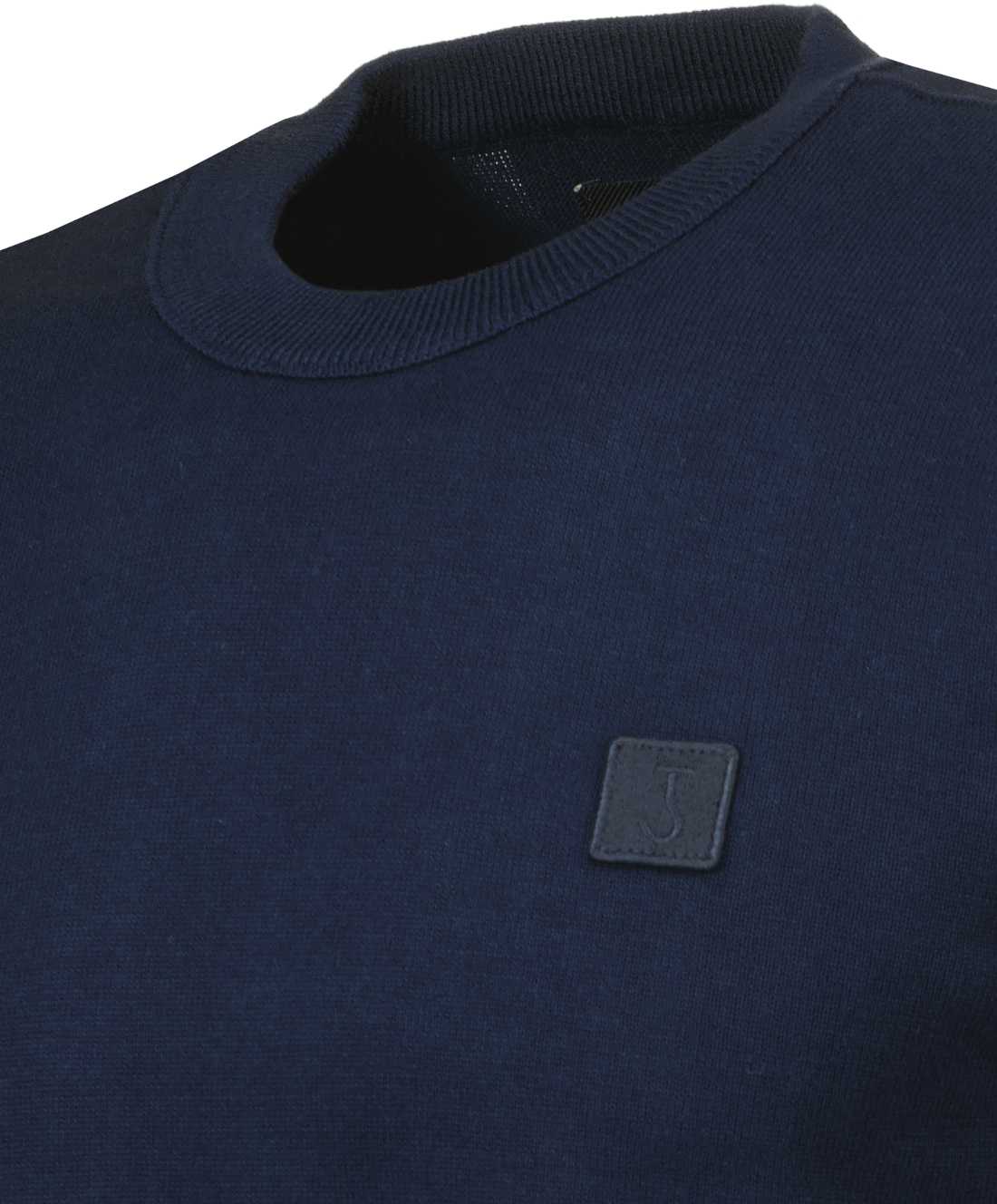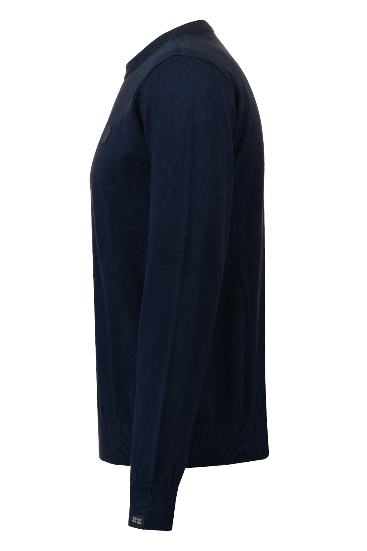 Donkerblauwe trui voor heren model Clifden Crew van Butcher of Blue. De trui is gemaakt van organisch katoen, heeft een ronde hals die mooi aangesloten zit en unieke details als de herkenbare naden op de schouder en de ton-sur-ton logopatch op de linkerborst.
