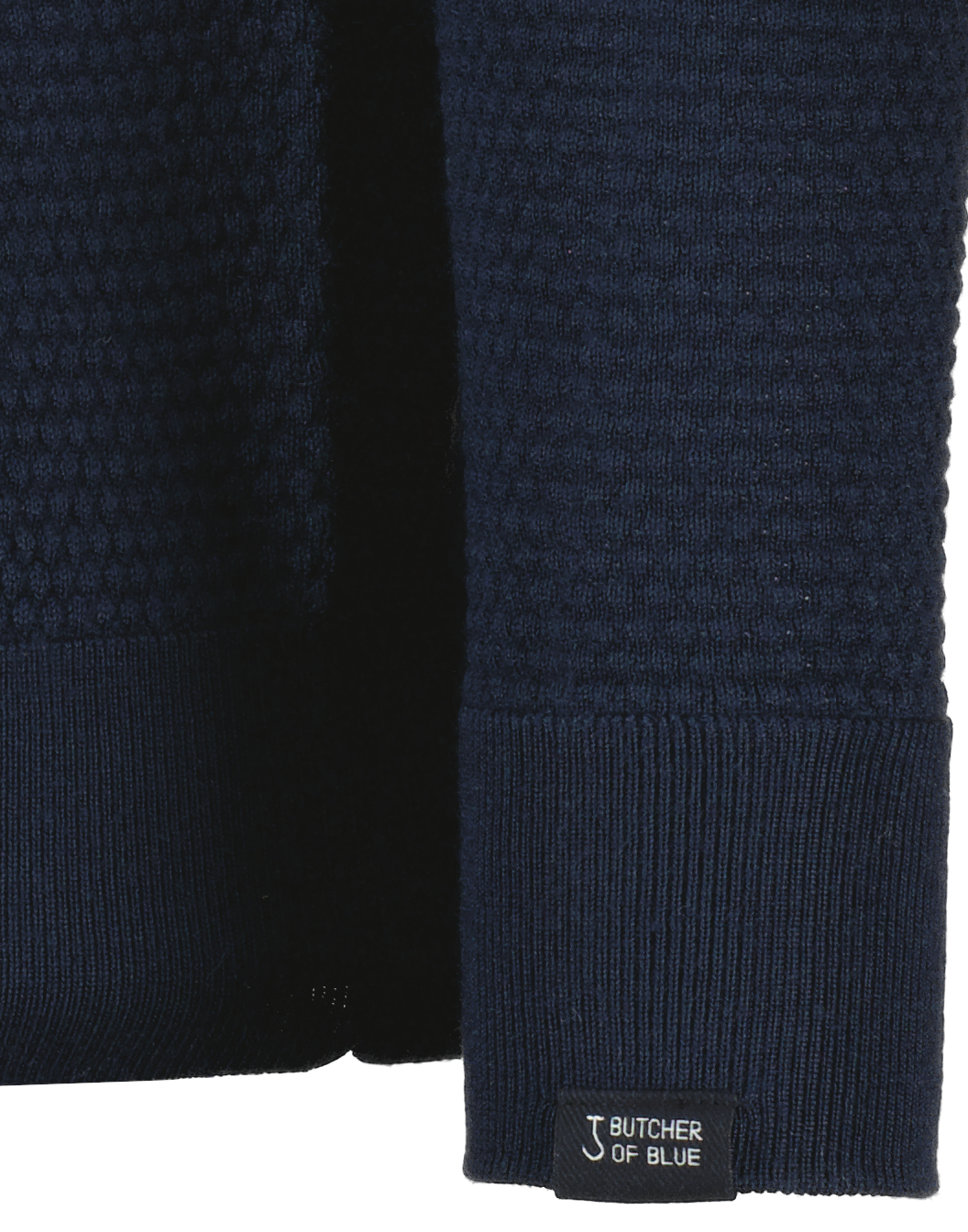 Donkerblauwe, gebreide trui voor heren model Structure Crew van Butcher of Blue. De Structure heeft een bolletjespatroon in de stof, heeft licht geribde hals, manchetten en onderband, heeft een logobadge op de linkerborst, een subtiel logo label op de linkermouw en valt regular fit.