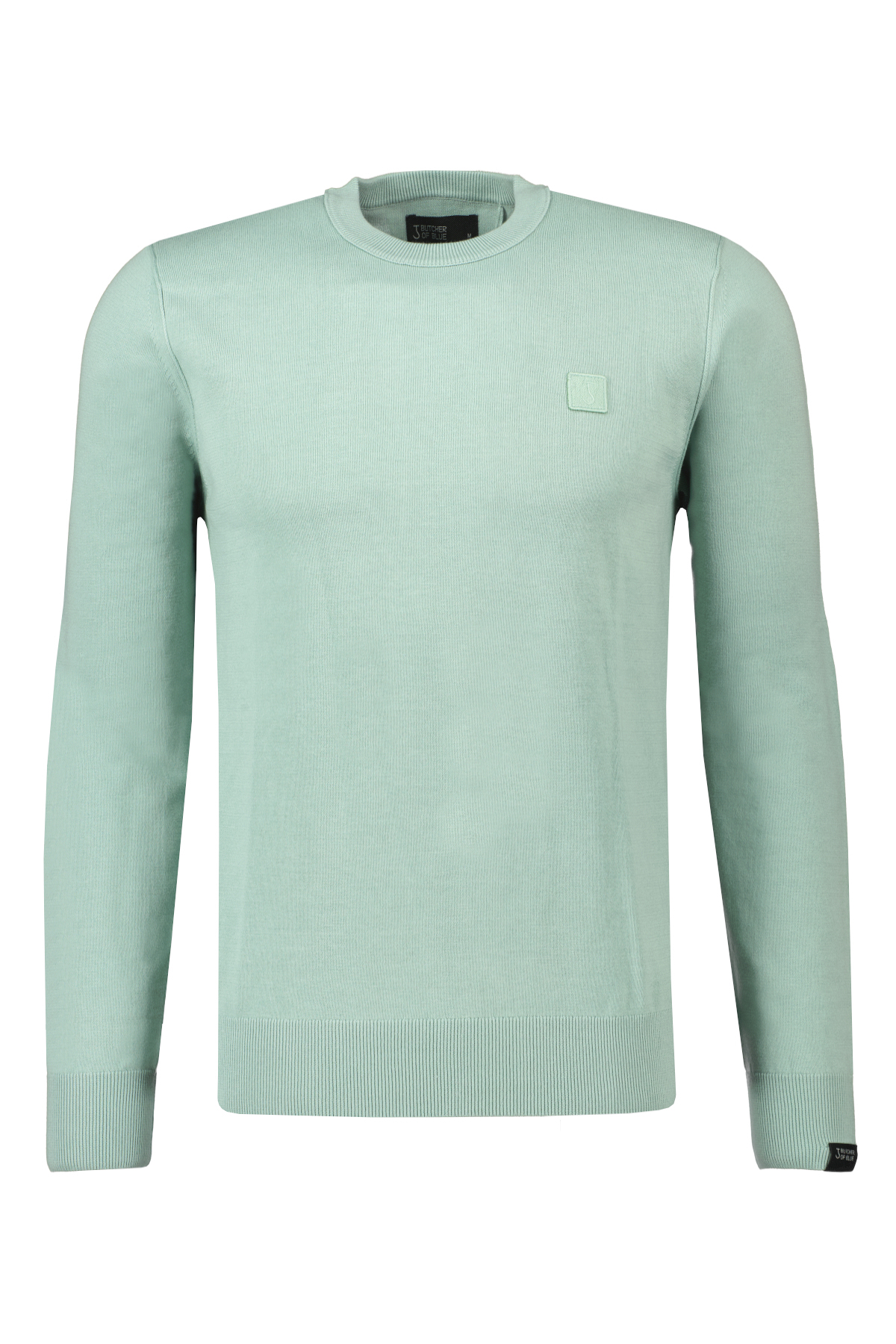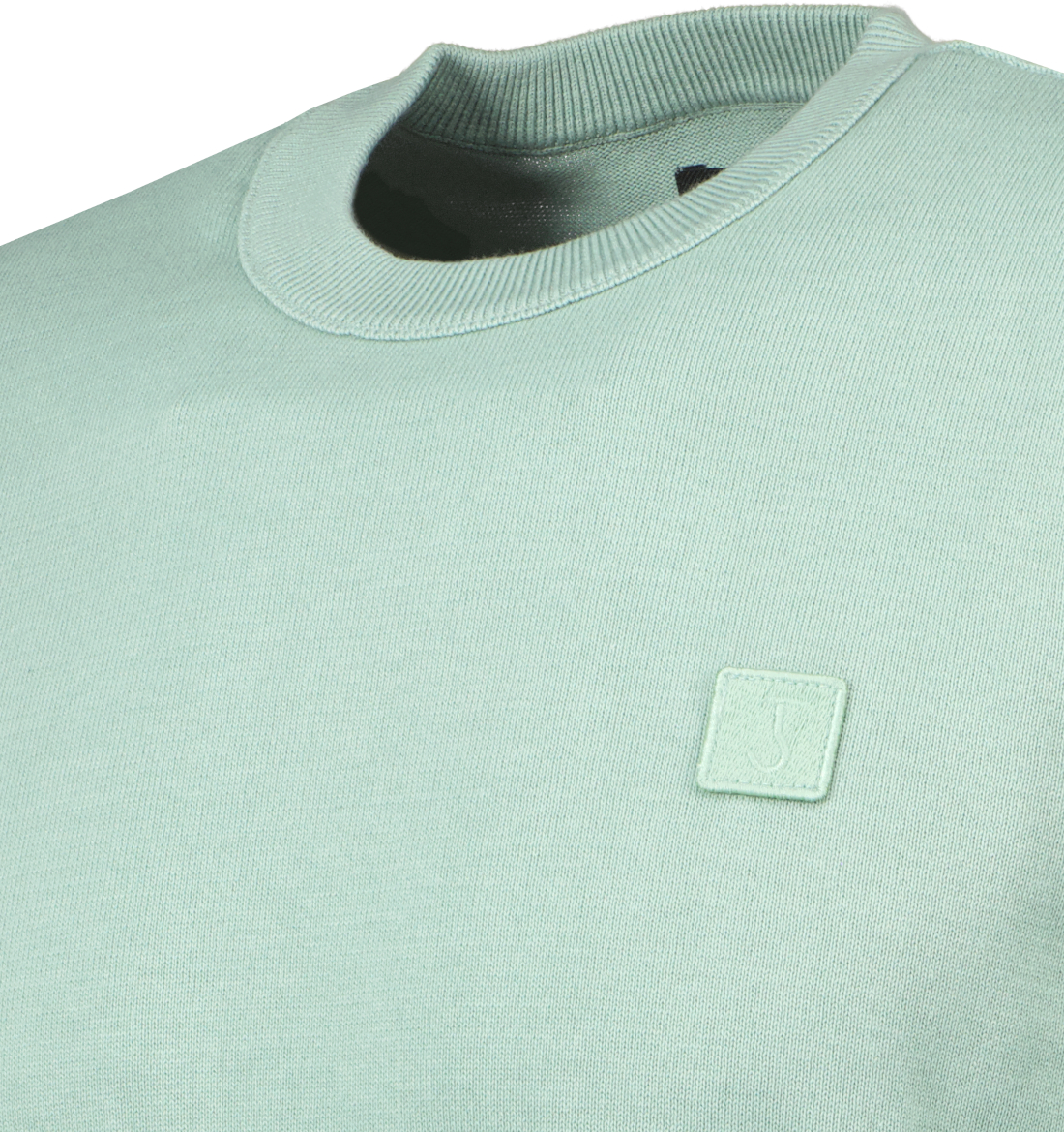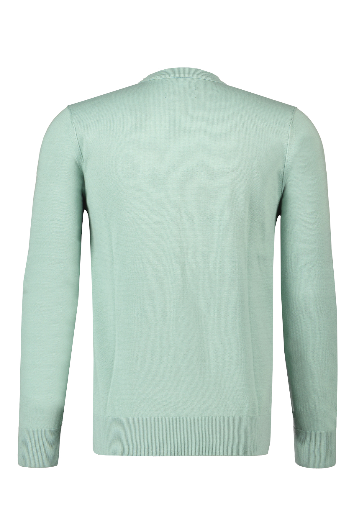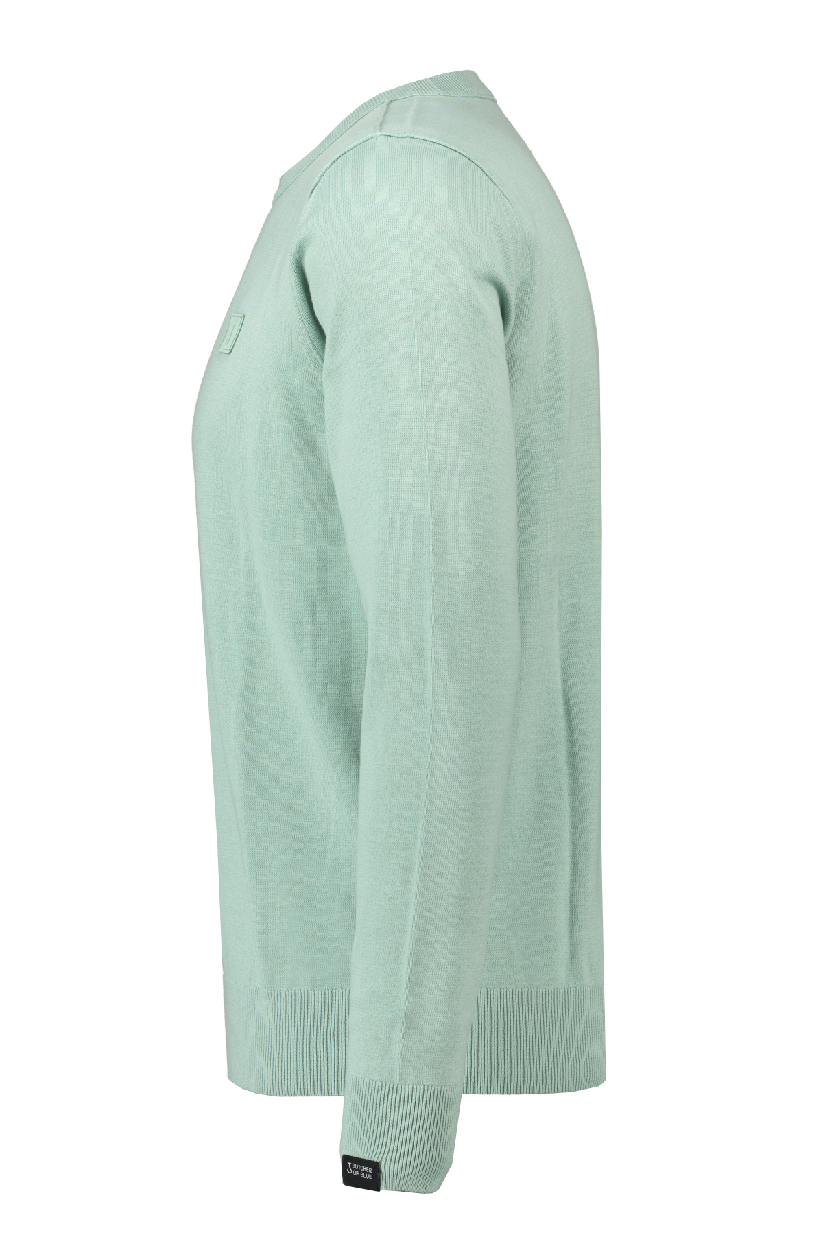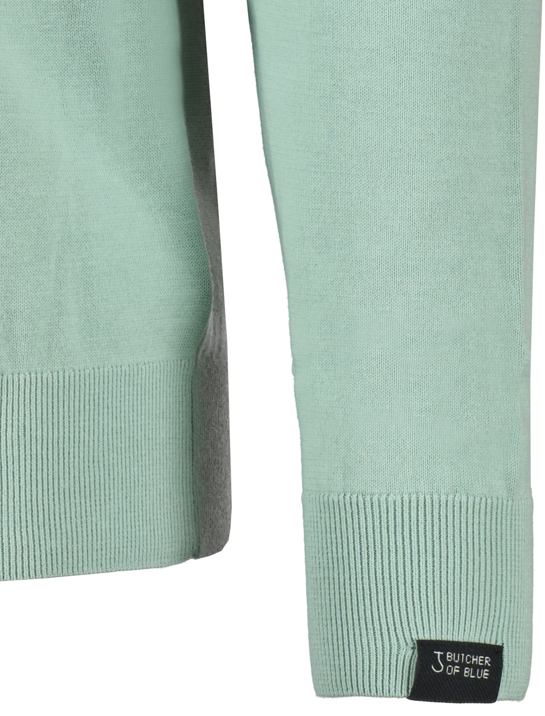 Lichtgroene trui voor heren model Clifden Crew van Butcher of Blue. De trui is gemaakt van organisch katoen, heeft een ronde hals die mooi aangesloten zit en unieke details als de herkenbare naden op de schouder en de ton-sur-ton logopatch op de linkerborst.