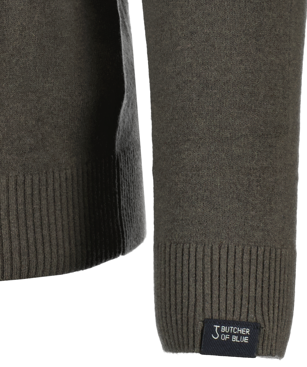 Donkergroene trui voor heren model Clifden Mock van Butcher of Blue. Deze trui heeft een grof geribde mockneck, geribde manchetten en onderband, heeft een ton-sur-ton logobadge op de linkerborst, een subtiel logo label op de linkermouw en komt in regular fit.