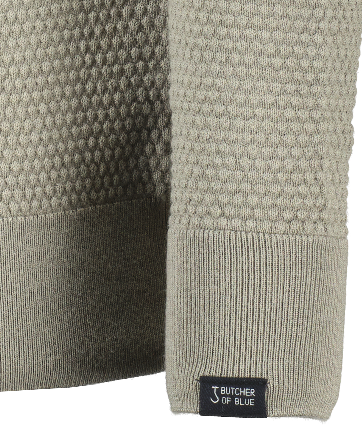 Groene half-zip trui voor heren model Structure Halfzip van Butcher of Blue. De Structure heeft een bolletjespatroon in de stof, heeft licht geribde hals, manchetten en onderband, heeft een logobadge op de linkerborst, een subtiel logo label op de linkermouw en valt regular fit.