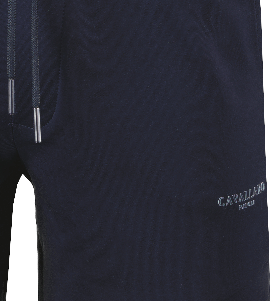 Donkerblauwe broek voor heren model Murano Jogger van Cavallaro Napoli. De Murano is gemaakt van een zachte katoenblend met stretch, heeft een elastische tailleband, drawstring sluiting, steekzakken en een subtiel ton-sur-ton logo onder de linker steekzak.