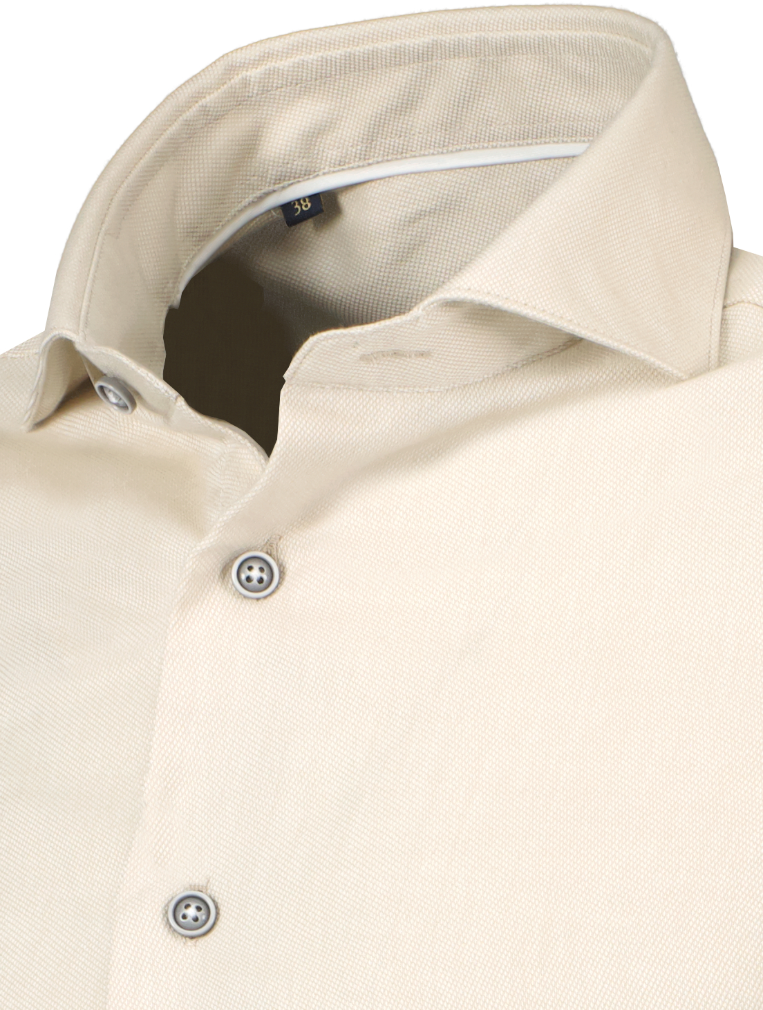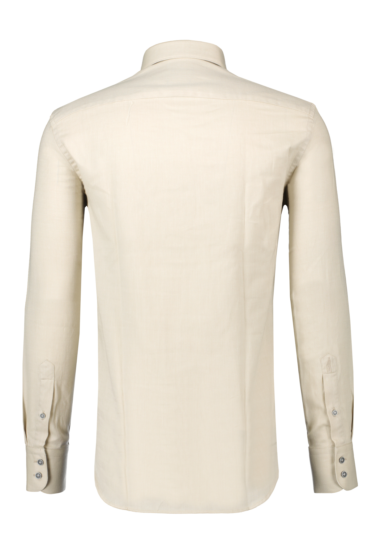 Lichtbeige overhemd voor heren model Seregno van Cavallaro Napoli. De Seregno is vervaardigd van 100% zacht katoen met geborstelde afwerking, heeft contrasterende knopen met kraaienpoot knoopaanzet, heeft een widespread kraag en enkele manchetten en valt slim fit.
