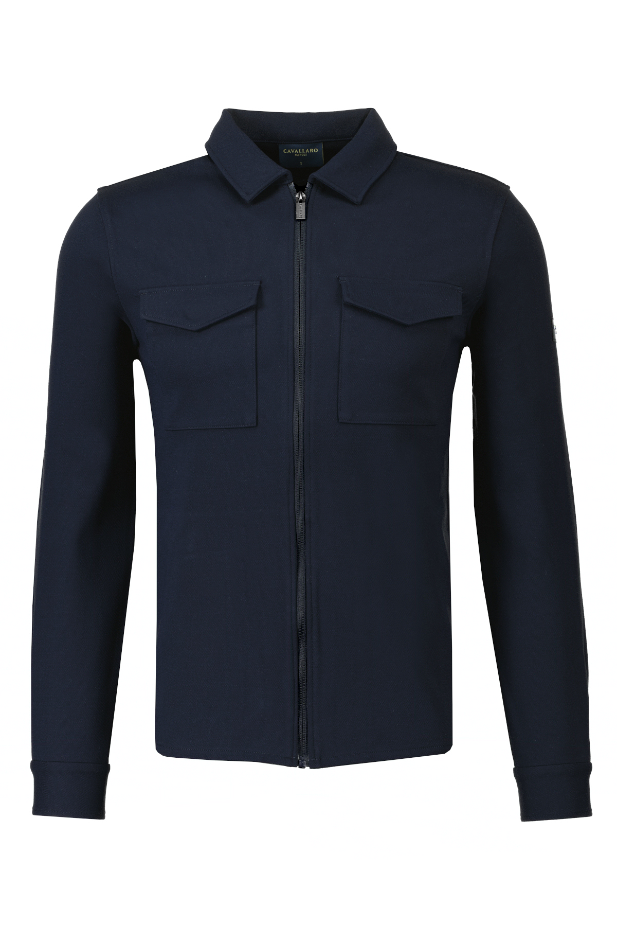 Donkerblauw overshirt voor heren model Zerino van Cavallaro Napoli. De Zerino is gemaakt van een bamboeblend en lichte stretch, heeft borstzakken met drukknopen, steekzakken met meshvoering, regular fit, donkere metale ritssluiting en een ton-sur-ton logo badge op de linkermouw.