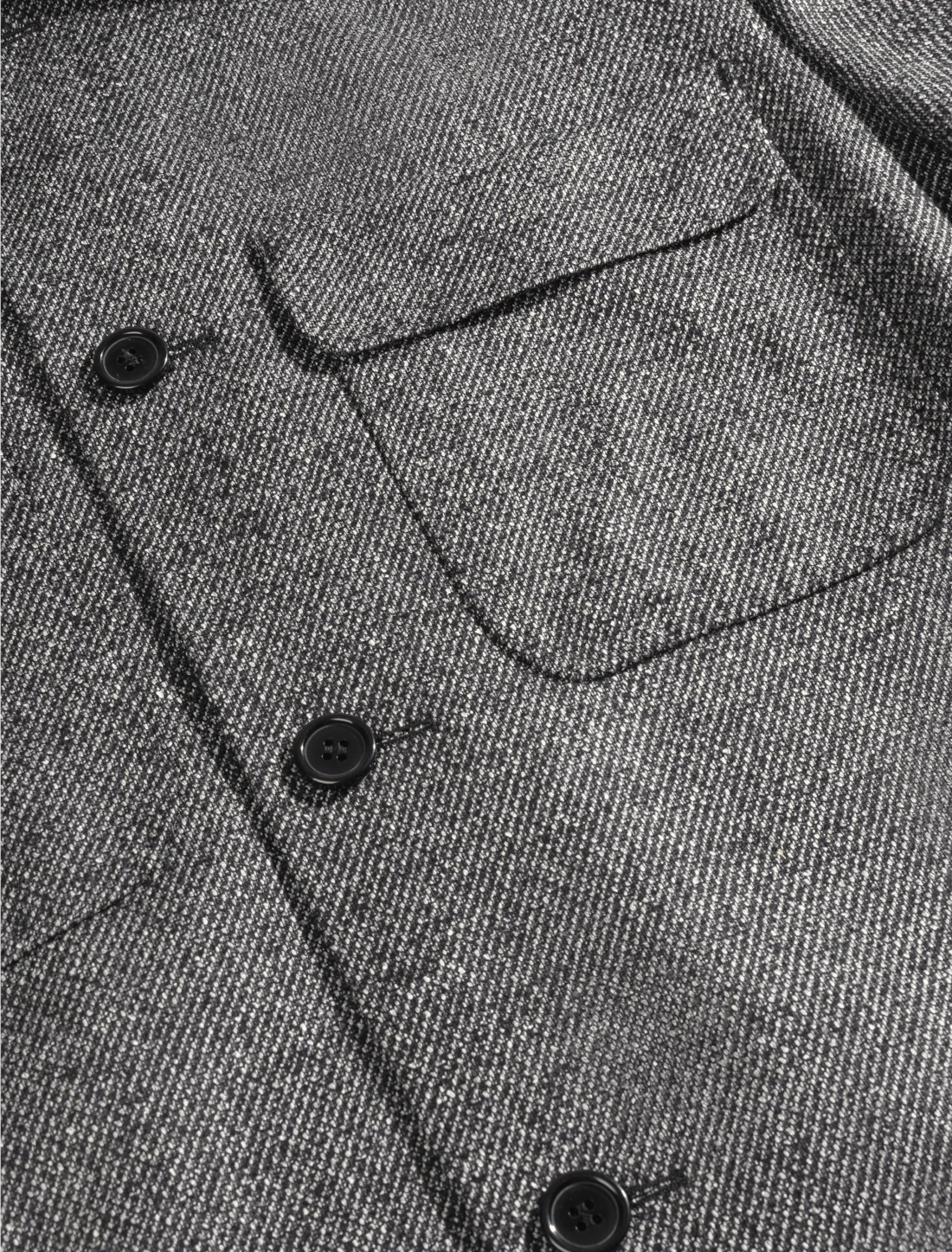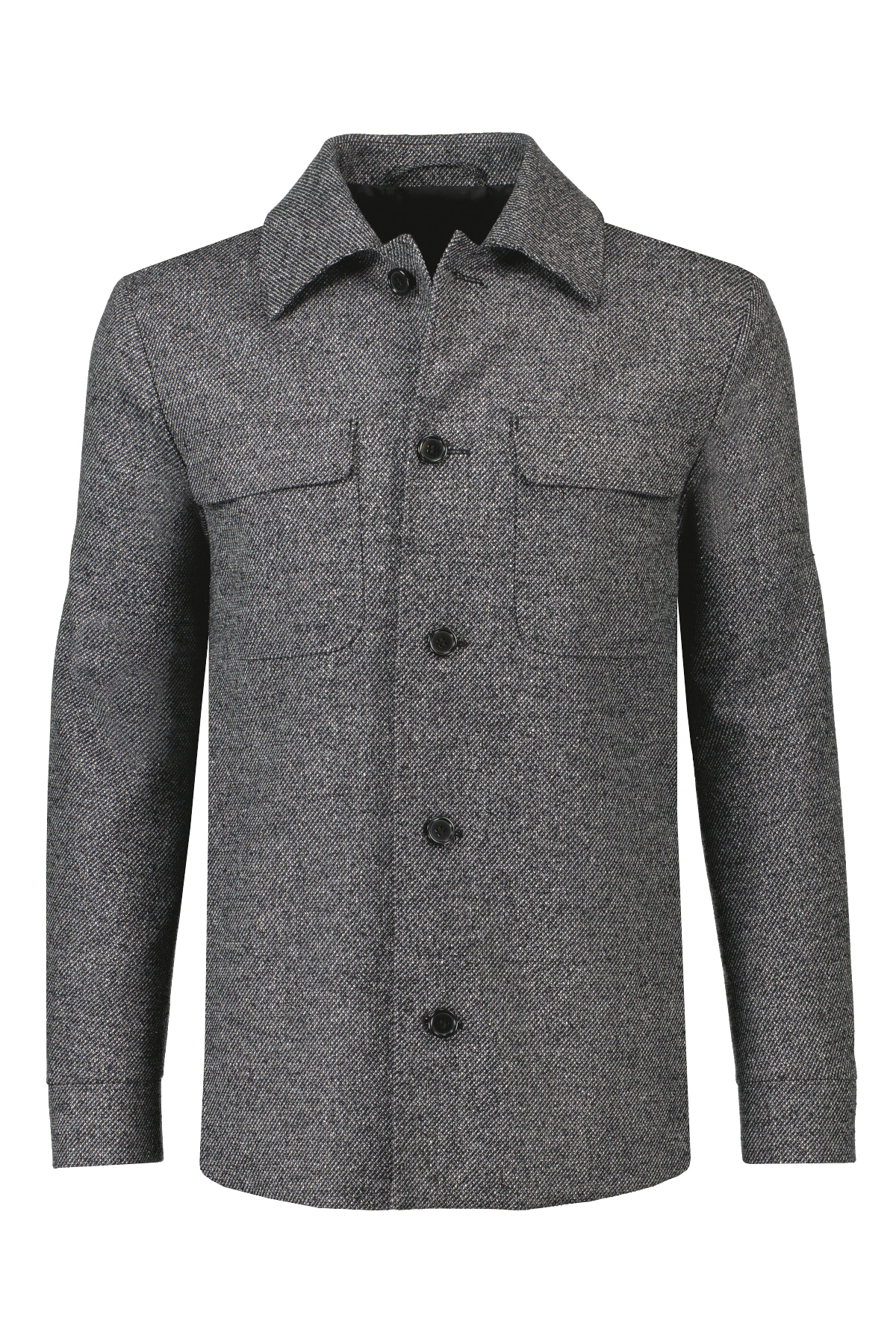 Antractietgrijs overshirt uit de Platinum collectie voor heren model Alghero van Cavallaro Napoli. De Alghero is uitgevoerd in een hoogwaardige wol-zijde blend en met een verfijnde gemêleerde structuur, is afgewerkt met een knoopsluiting en opgestikte klepzakken en komt in regular fit.