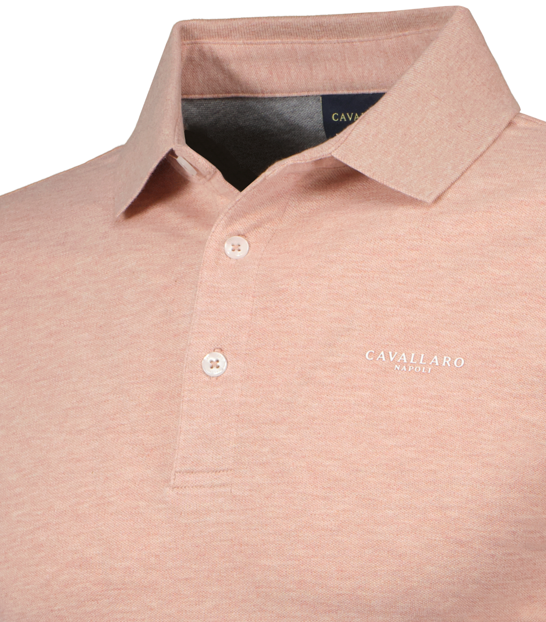 Roze gemêleerde polo voor heren model Bavone Polo van Cavallaro Napoli. De Bavone is gemaakt van hoogwaardig organisch katoen met een vleugje elastaan, heeft een wit opgedrukt logo op de borst, heeft een klassieke polokraag met drie parelmoer knoopjes, korte mouwen en een aangesloten fit.
