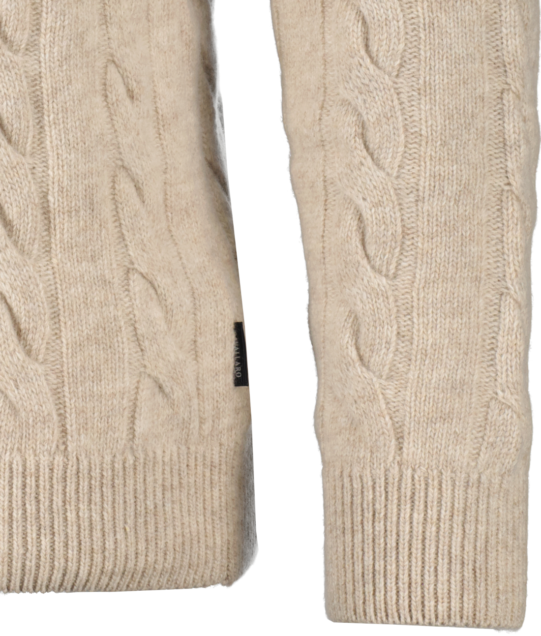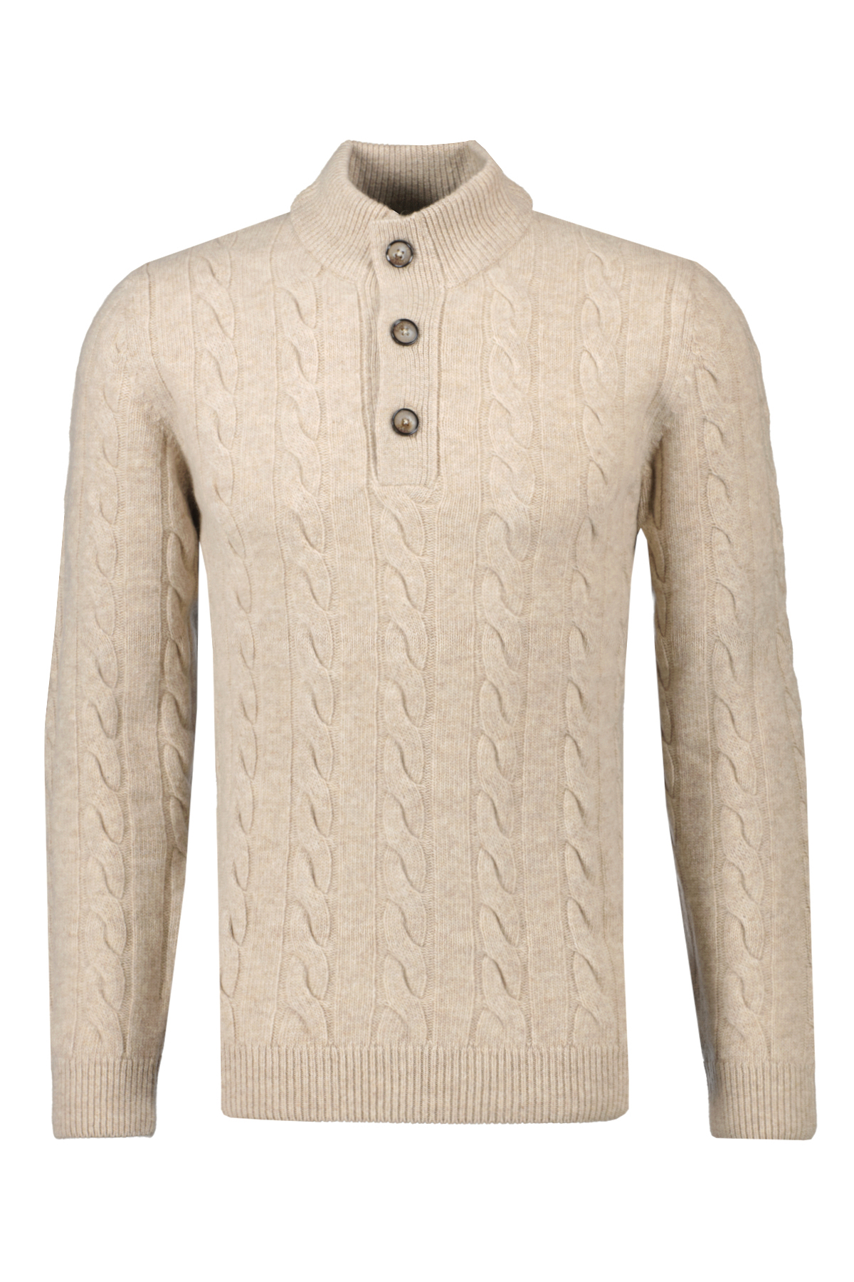Beige gebreide half button trui uit de Platinum Collectie voor heren model Demezio Half Button van Cavallaro Napoli. De Demezio is gemaakt van een luxueuze wol-kasjmierblend wat zacht aanvoelt, is warm maar toch licht, en behoudt langdurig zijn vorm. Daarnaast heeft de trui een kabelbreisel, knopen met logo en een geribde hals, manchetten en onderband.