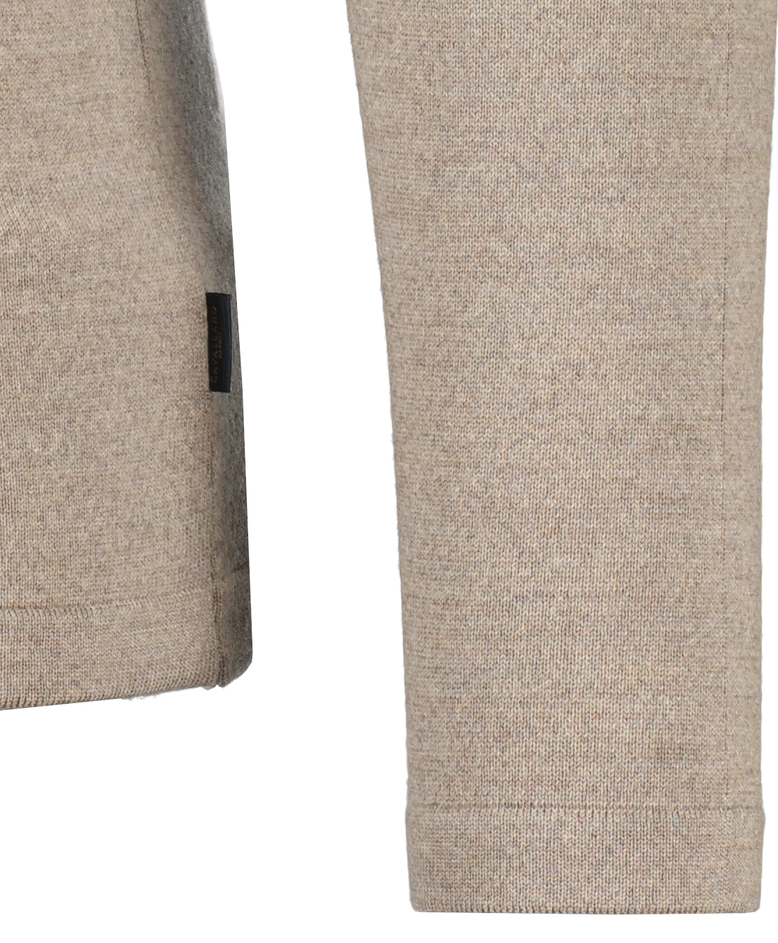 Taupe half-zip trui met polokraag voor heren model Merino Zip Polo van Cavallaro Napoli. De Merino Zip Polo is gemaakt van 100% Italiaanse merinowol, heeft een regular fit en een logo badge op de linkermouw.