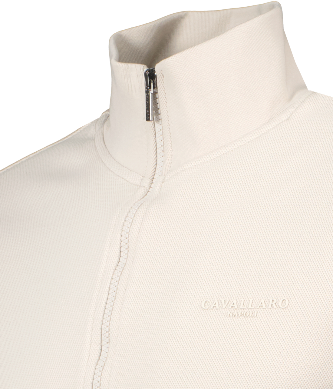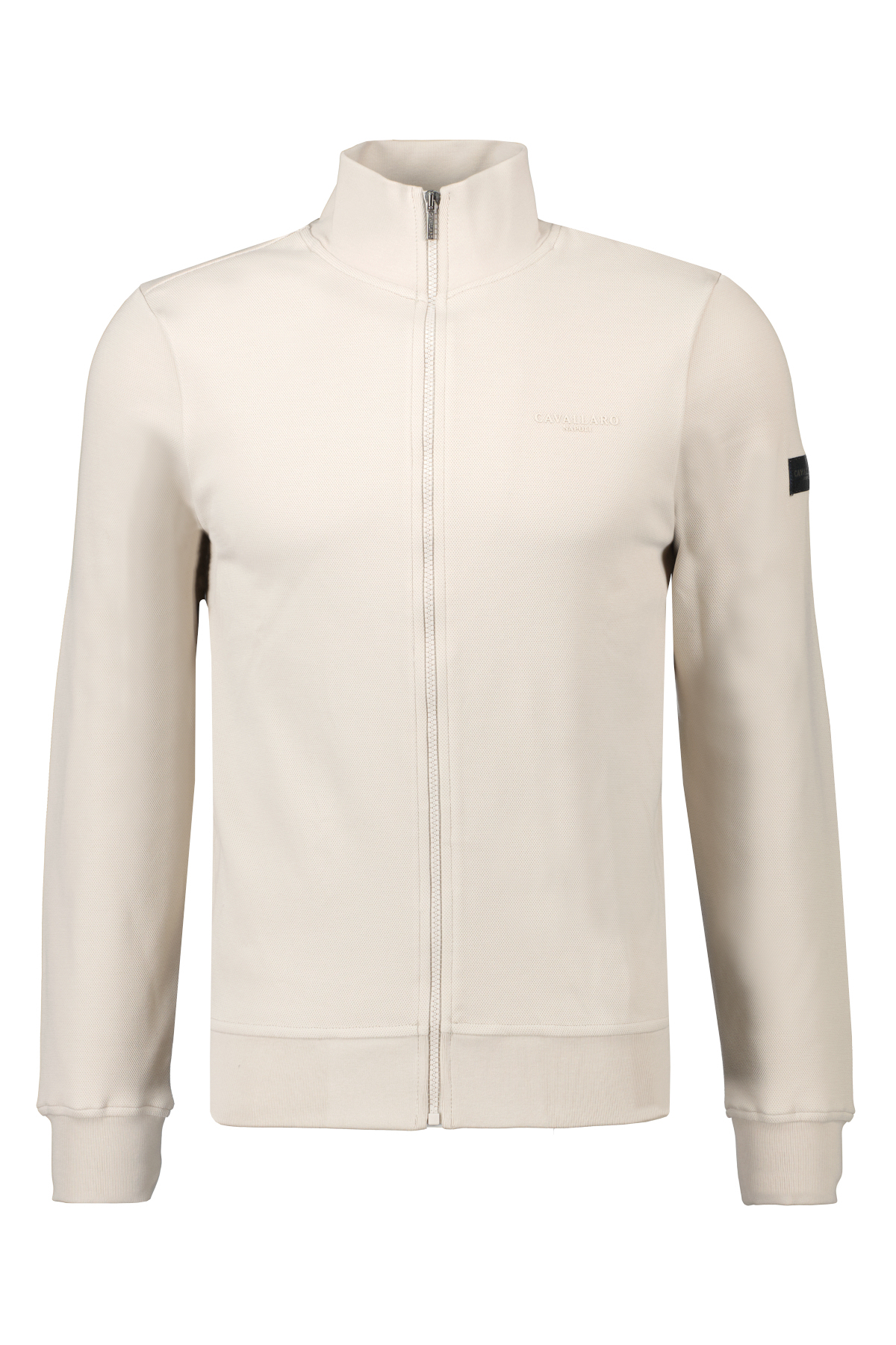 Lichtbeige vest voor heren model Francio van Cavallaro Napoli. De Francio is gemaakt van een katoenblend en is uitgevoerd in een subtiel piqué geweven stof met stretch, heeft een ton-sur-ton logo op de borst, een logo-badge op de mouw een hoge kraag en komt in regular fit.