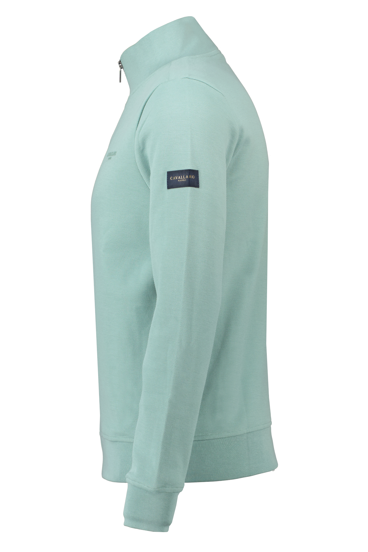 Groen vest voor heren model Francio van Cavallaro Napoli. De Francio is gemaakt van een katoenblend en is uitgevoerd in een subtiel piqué geweven stof met stretch, heeft een ton-sur-ton logo op de borst, een logo-badge op de mouw een hoge kraag en komt in regular fit.