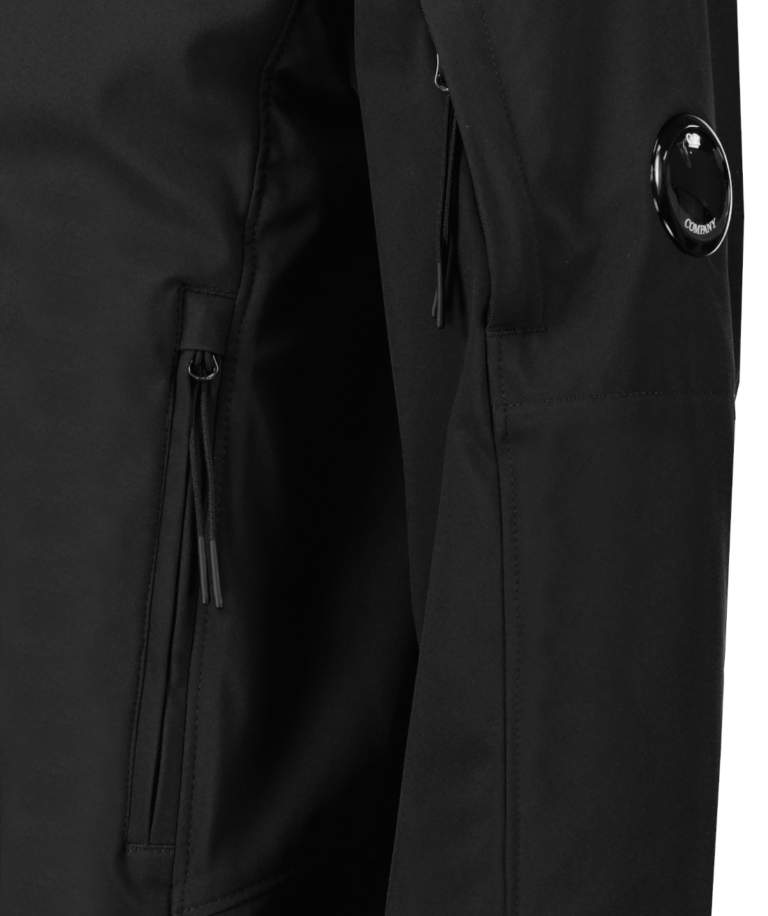 Zwarte C.P. Company heren Softshell jas met verstelbare capuchon. De jas sluit met een dubbele rits. Twee steekzakken die sluiten met rits en op de linkerarm een extra zak onder de C.P. patch. De mouwen en onderzijde zijn afgewerkt met een geribde zoom.