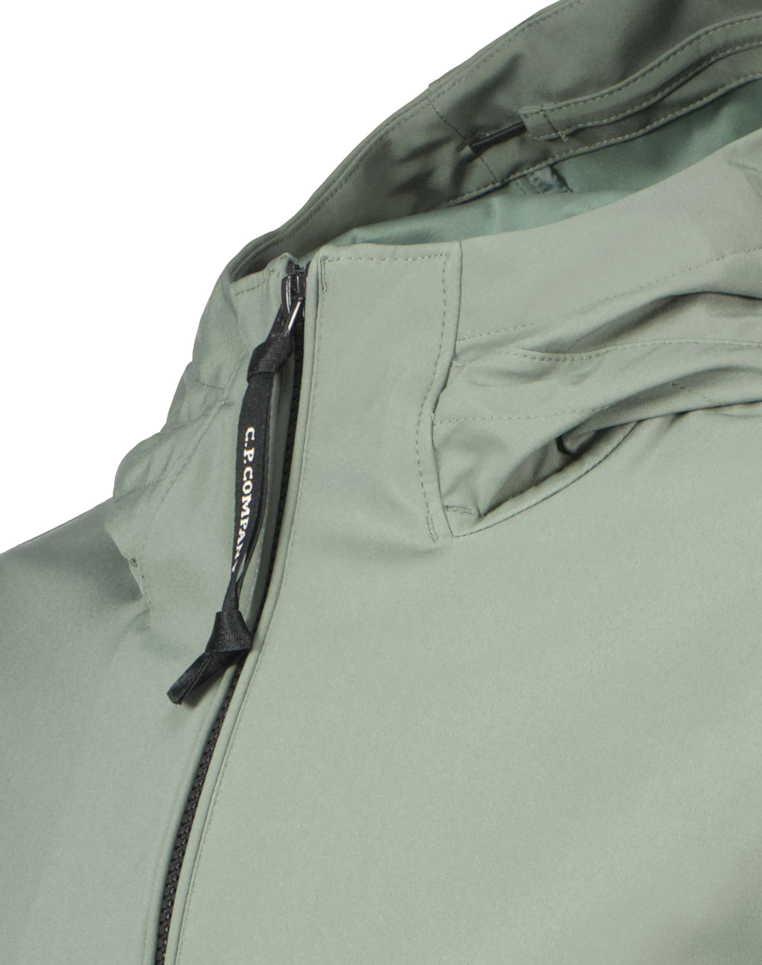 Groene softshell jas voor heren van C.P. Company. Dit jack met verstelbare capuchon vervaardigd in C.P. Shell-R, een 3-laags softshell-stretch, is gemaakt van gerecycled polyestergaren. Daarnaast heeft de jas een dubbele ritssluiting, zijzakken met ritssluiting en het lensdetail.