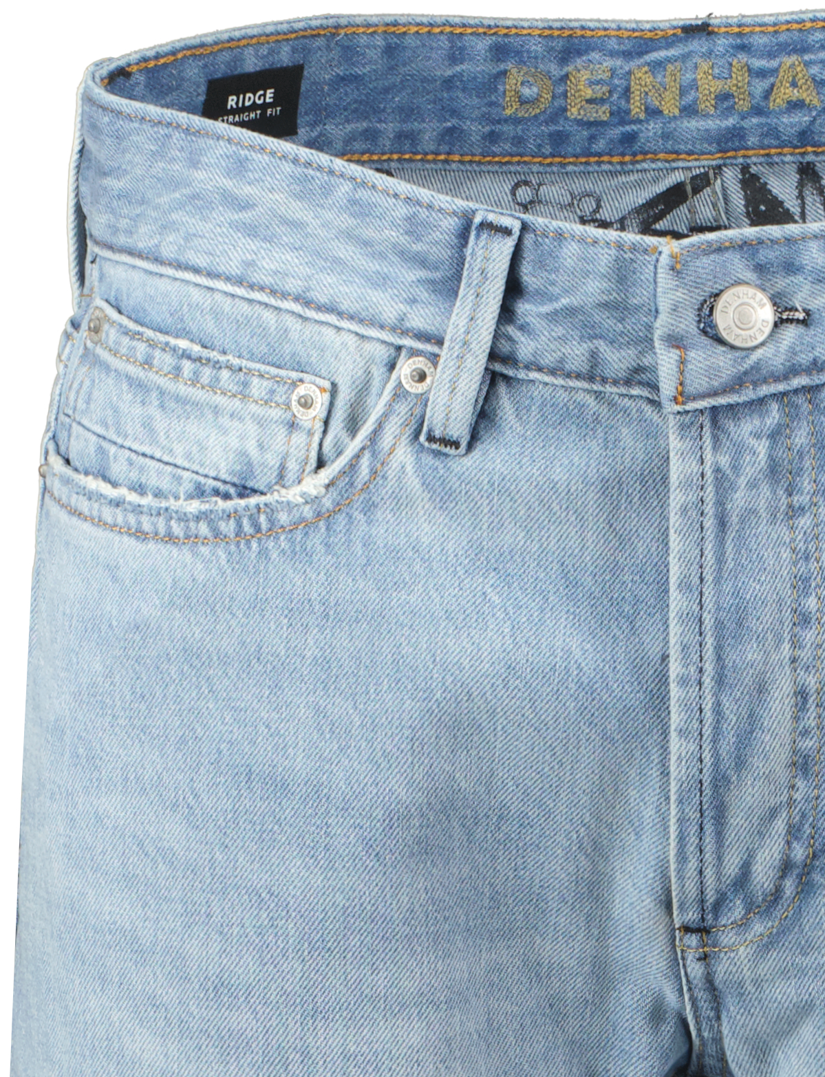 Lichtblauwe broek voor heren model Ridge van Denham. De Ridge is een five-pocket jeans met rechte pijp, gemaakt van rigid denim met lichte wassing en handmatige abrasies voor een gedragen look. Ridge denim dat soepeler wordt bij het dragen. Heeft een regular taille en knoopsluiting.