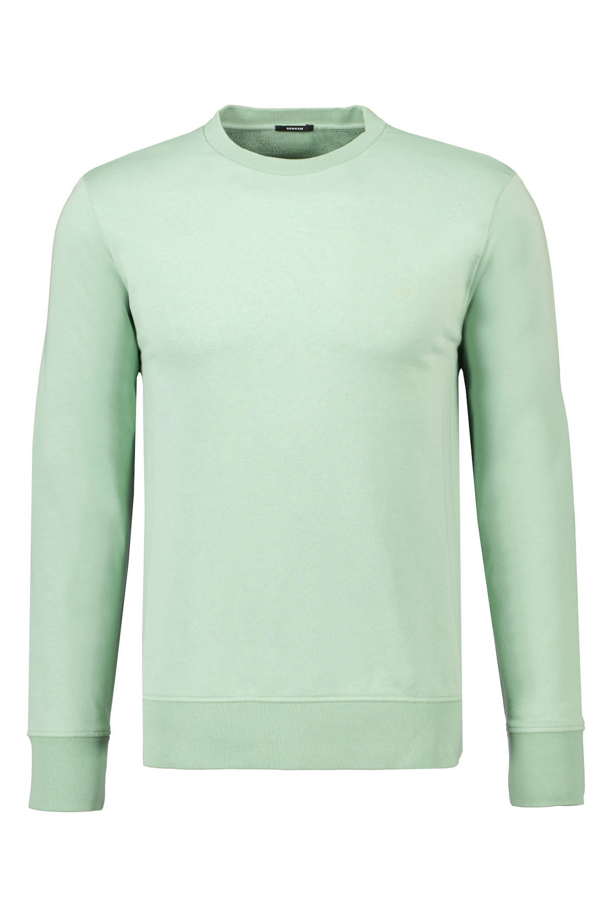 Groene sweater voor heren model Scissor Crew van Denham. De Scissor Crew heeft een ronde hals en een normale pasvorm. De trui is gemaakt van een zachte, garment-dyed katoen/polyestermix, heeft een geribde hals, manchetten en onderband en heeft een subtiel schaarlogo op de linkerborst.