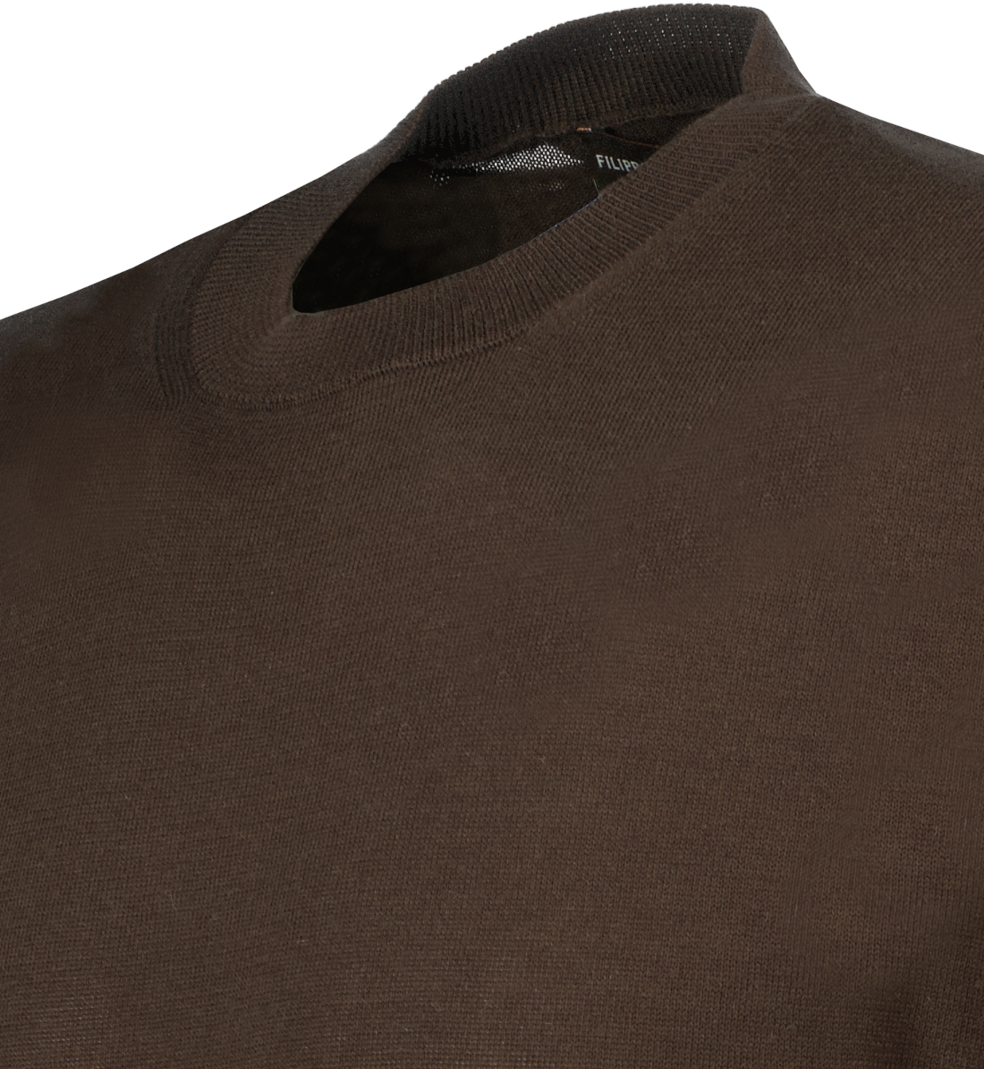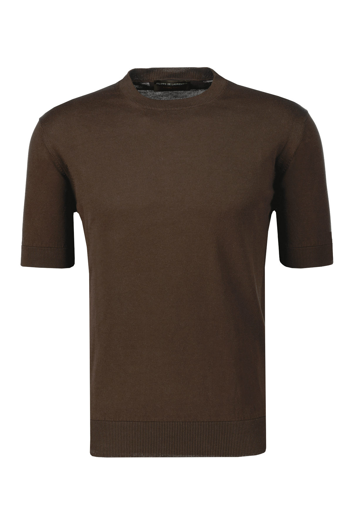 Donkerbruin T-shirt voor heren van Filippo de Laurentiis. Dit middelzware T-shirt is gemaakt van crêpekatoen en gewoven in een fijn mandpatroon, heeft een ronde hals, korte mouwen, geribbelde kraag, manchetten en zoom en is gemaakt in Italië.