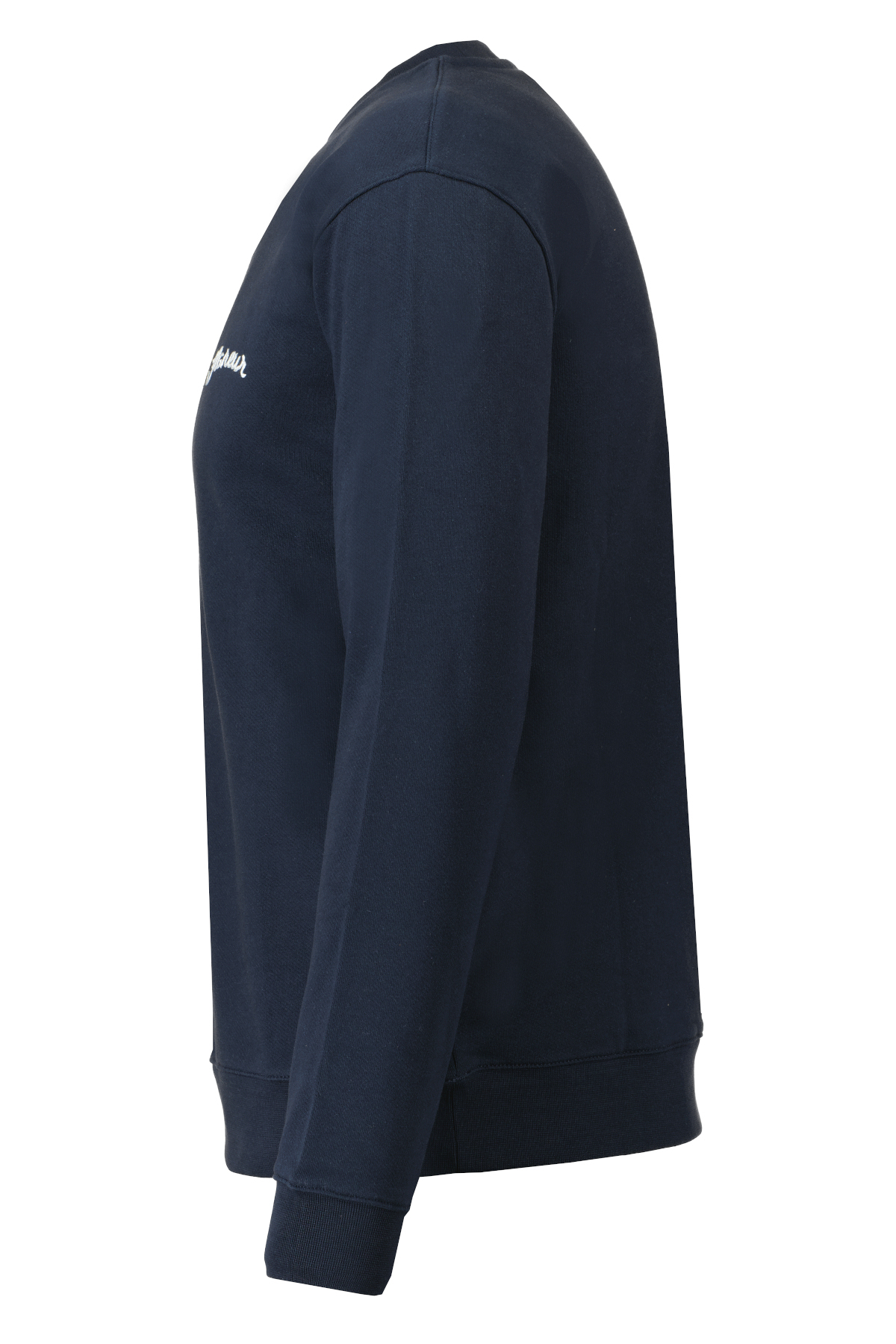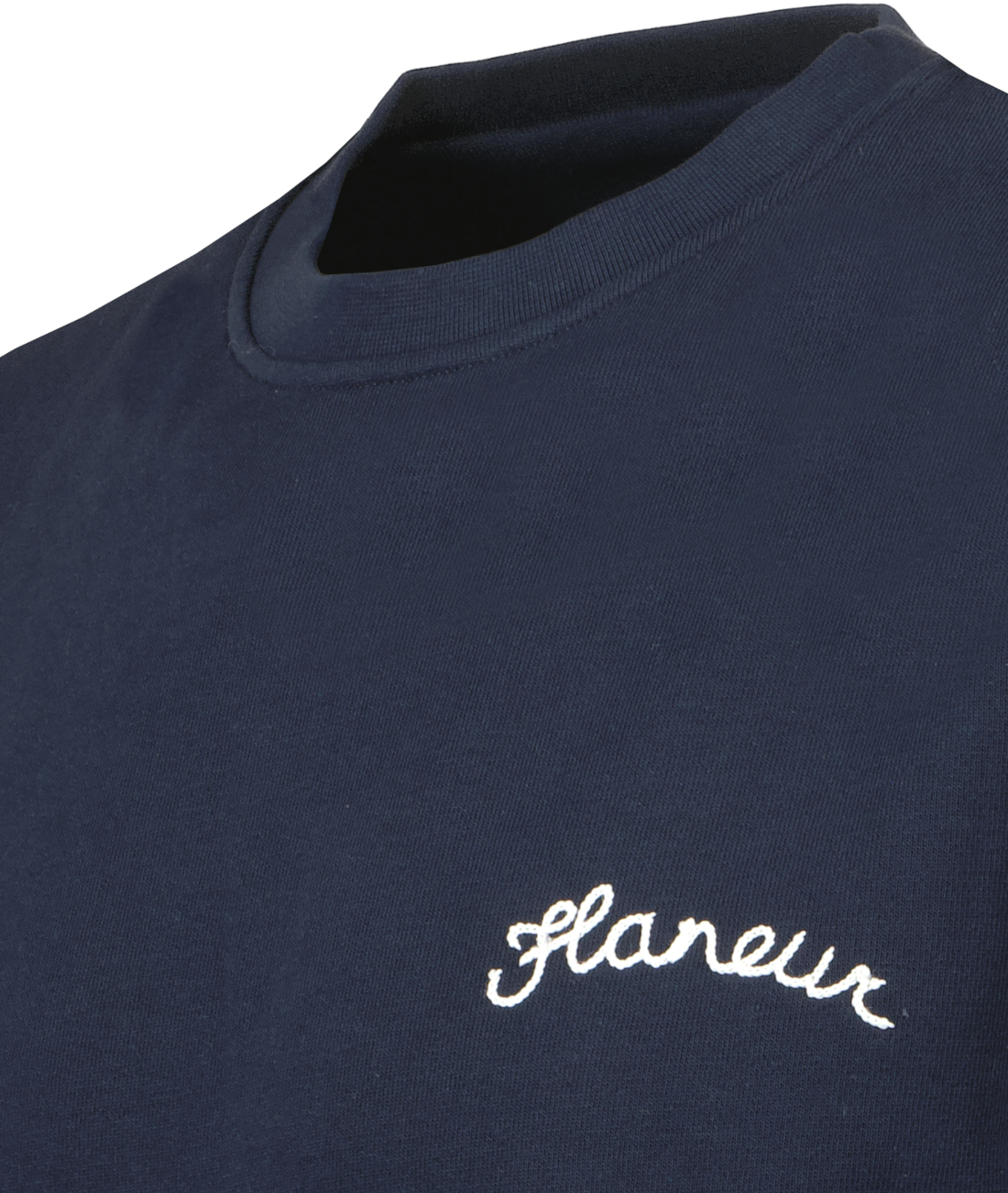 Donkerblauwe trui model Signature Sweater van Flâneur. De sweater heeft een ronde hals, is geribd afgewerkt bij de manchetten, boord en hals en de binnenkant is gemaakt van zacht fleece. Op de linkerborst staat het logo geborduurd in een witte kleur. De trui is van 100% katoen.