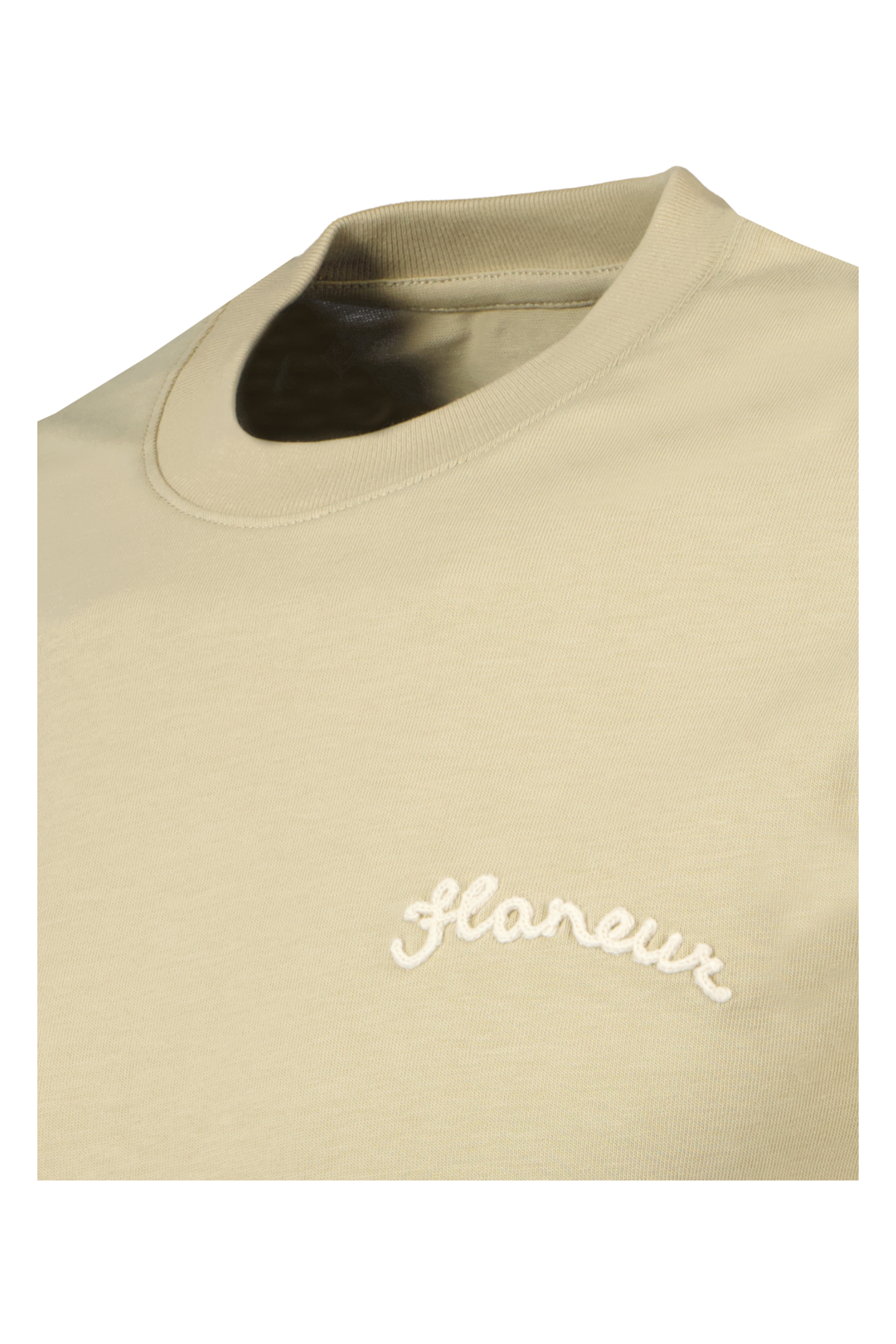 Beige T-shirt model Signature Tee van Flâneur. Dit shirt heeft korte mouwen, een ronde hals en een logo in het wit op de linkerborst.