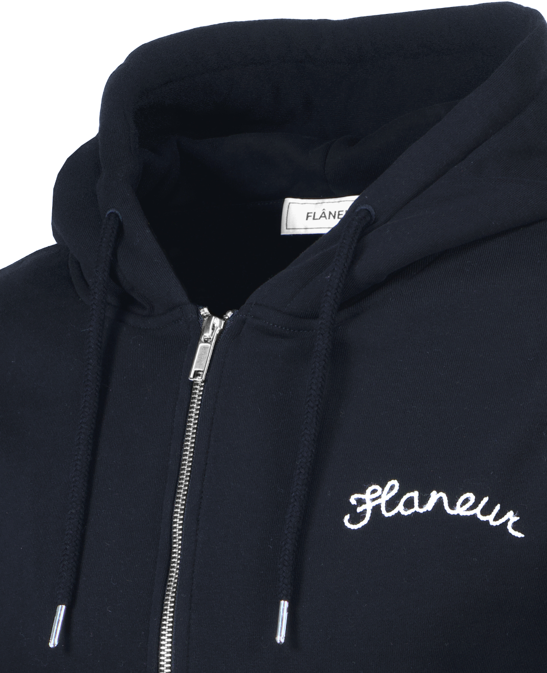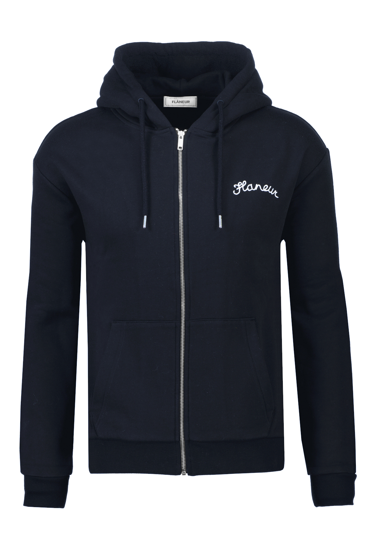 Donkerblauw vest model Signature Zip-Up van Flâneur. Dit vest heeft een capuchon met trekkoorden, is geribd afgewerkt bij de manchetten, boord en hals, en heeft een kangoeroezak. Daarnaast is de trui afgewerkt met een Flâneur logo in het wit.
