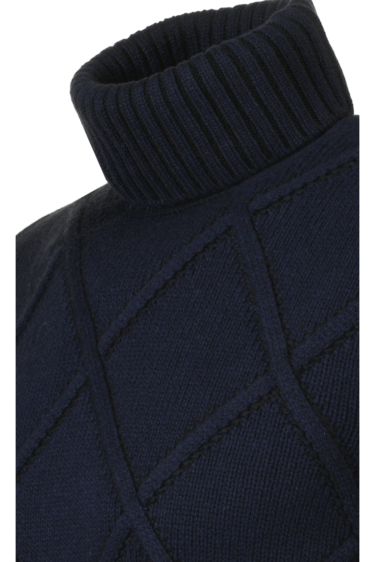 Donkerblauwe, grof gebreide coltrui met witte accenten voor heren van Gran Sasso. Deze trui heeft een geribde col, manchetten en onderband en is gemaakt van een wolblend met kasjmier.