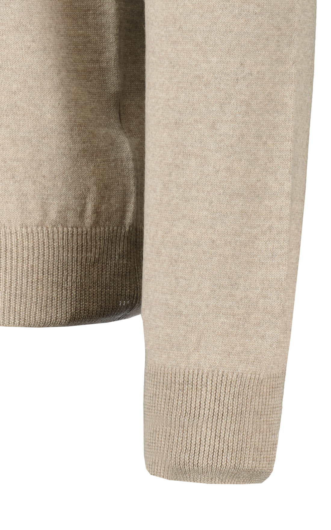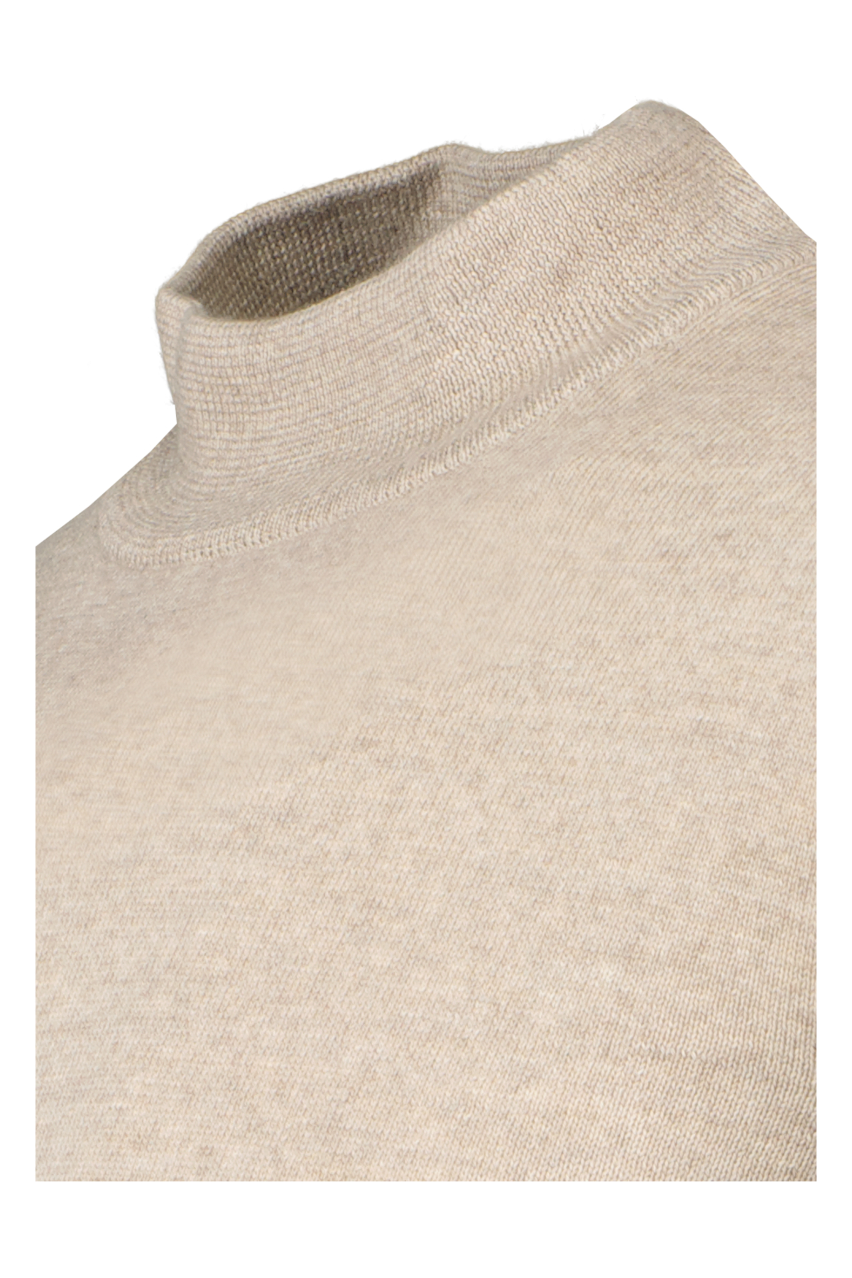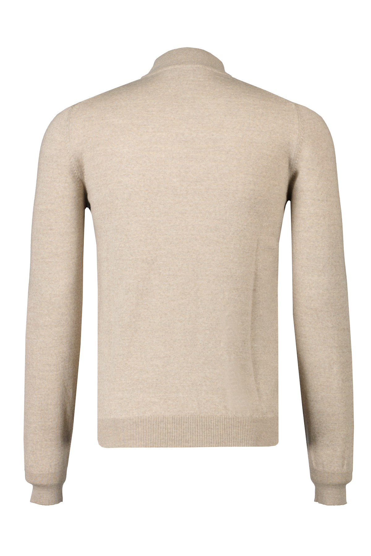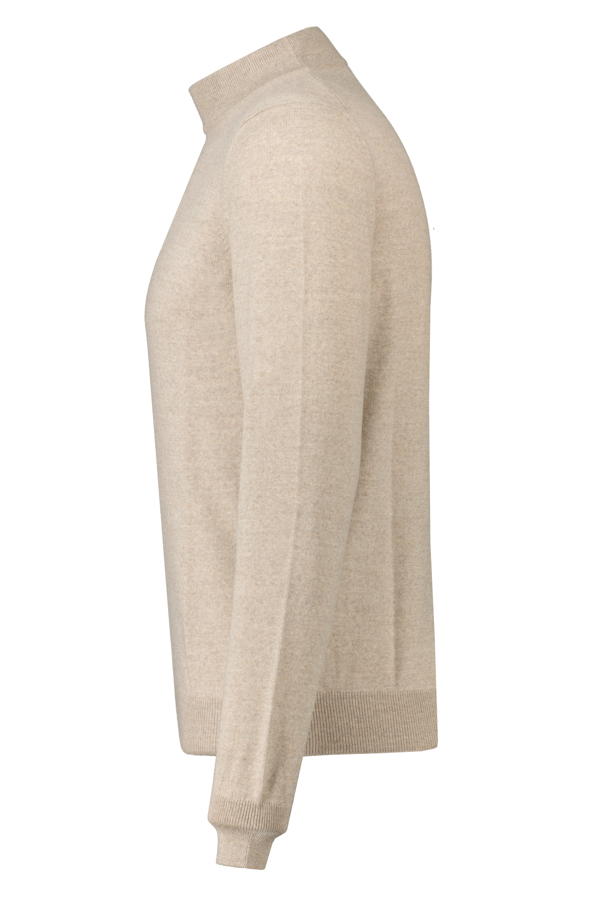 Beige trui voor heren van Gran Sasso. Deze trui heeft een hogere kraag, een geribde onderband, is gemaakt van 100% virgin wol en is gemaakt in Italië.