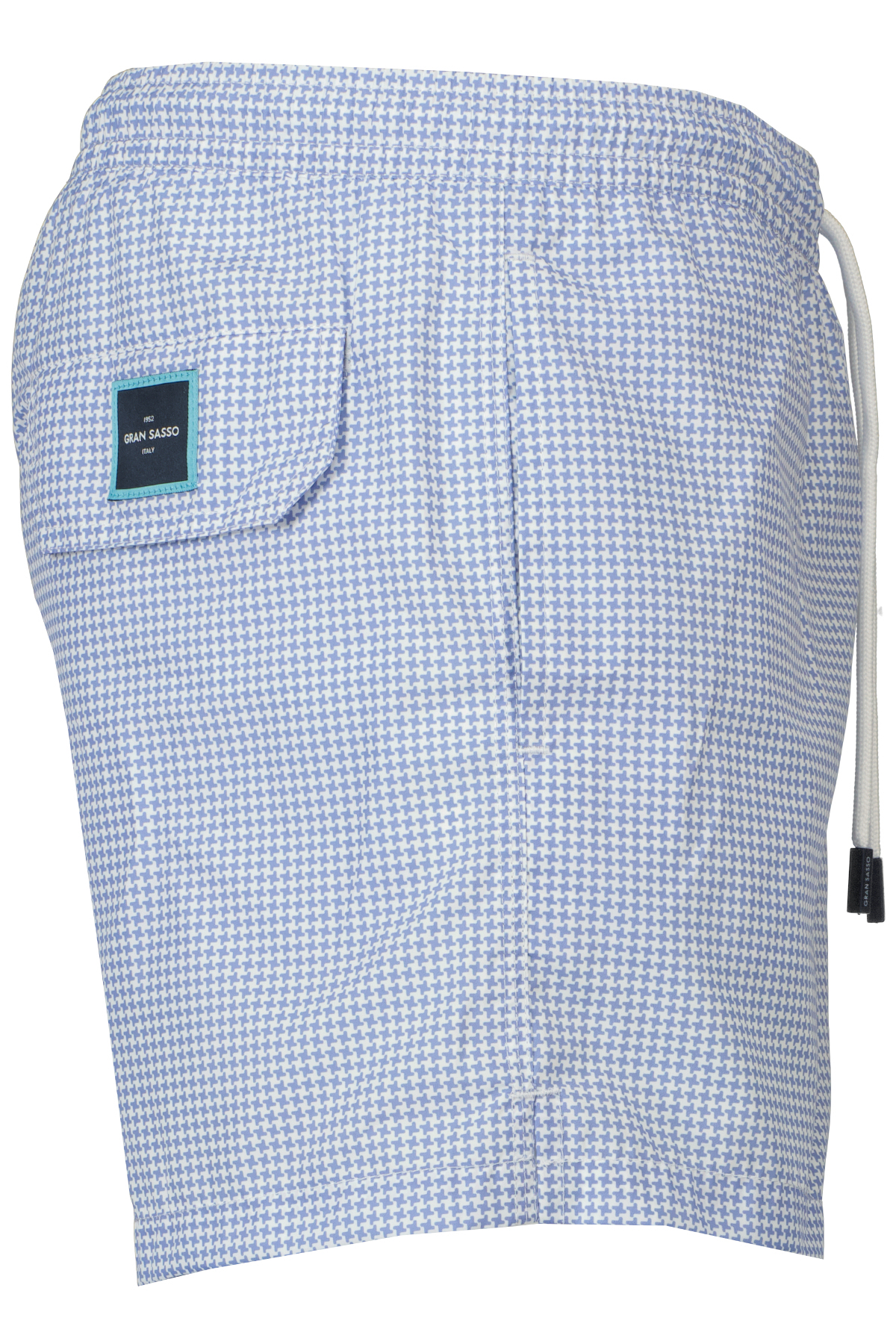Blauw met witte all-over print zwembroek van Gran Sasso. Deze zwembroek heeft witte trektouwtjes, twee steekzakken en één sluitbare achterzak met logo. Gemaakt van 100% gerecyled microvezel.