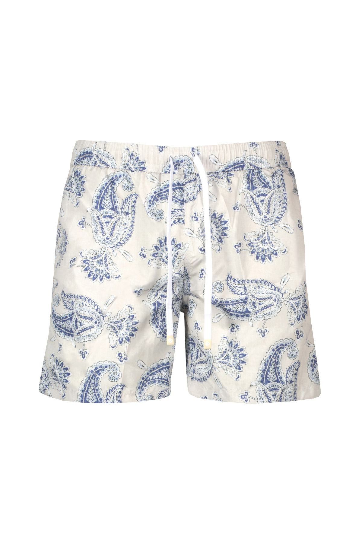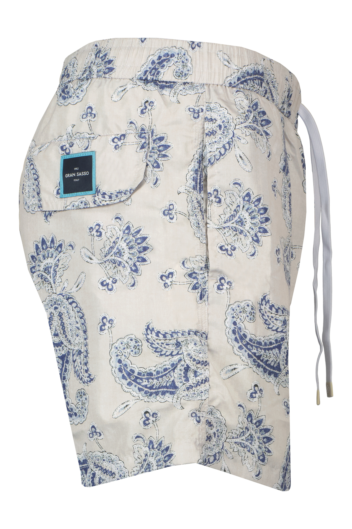 Lichtgrijs met blauwe zwemshort voor heren van Gran Sasso. Deze zwemshort heeft een mesh binnenbroek, witte contrasterende stiksels en heeft een elastische tailleband met trektouwtjes waarbij het logo op de uiteindes zijn gegraveerd. Gemaakt in Italië.