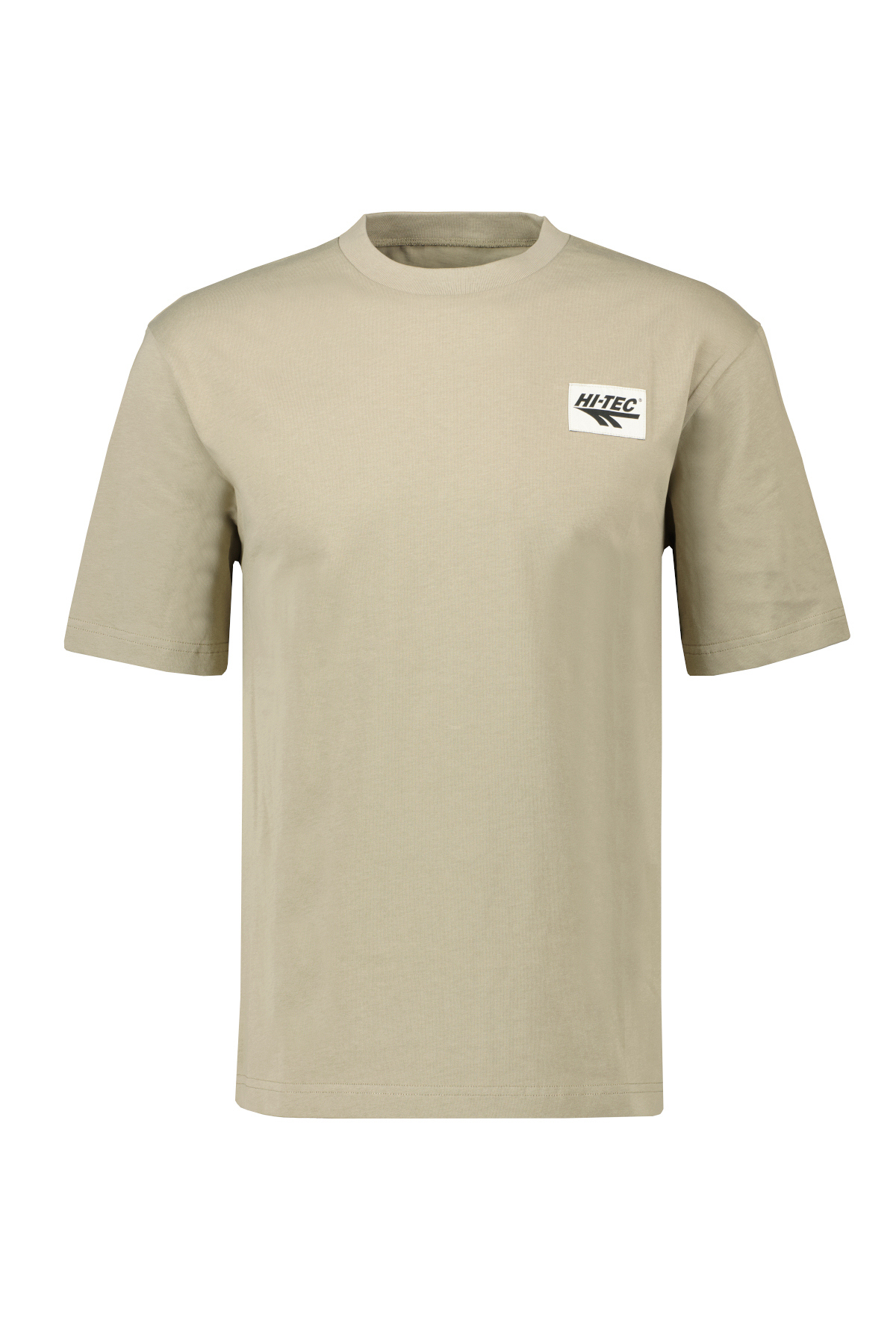 beige groen T-shirt voor heren van Hi-Tec. Dit T-shirt met korte mouwen en ronde hals is gemaakt van zacht 100% katoen, heeft een klassieke, relaxte pasvorm. en een gewoven HI-TEC logopatch op de borst. Het shirt is volledig omkeerbaar. Draag het aan de strakke kant voor een minimalistische look, of keer het binnenstebuiten voor een opvallend, gepersonaliseerd artwork.