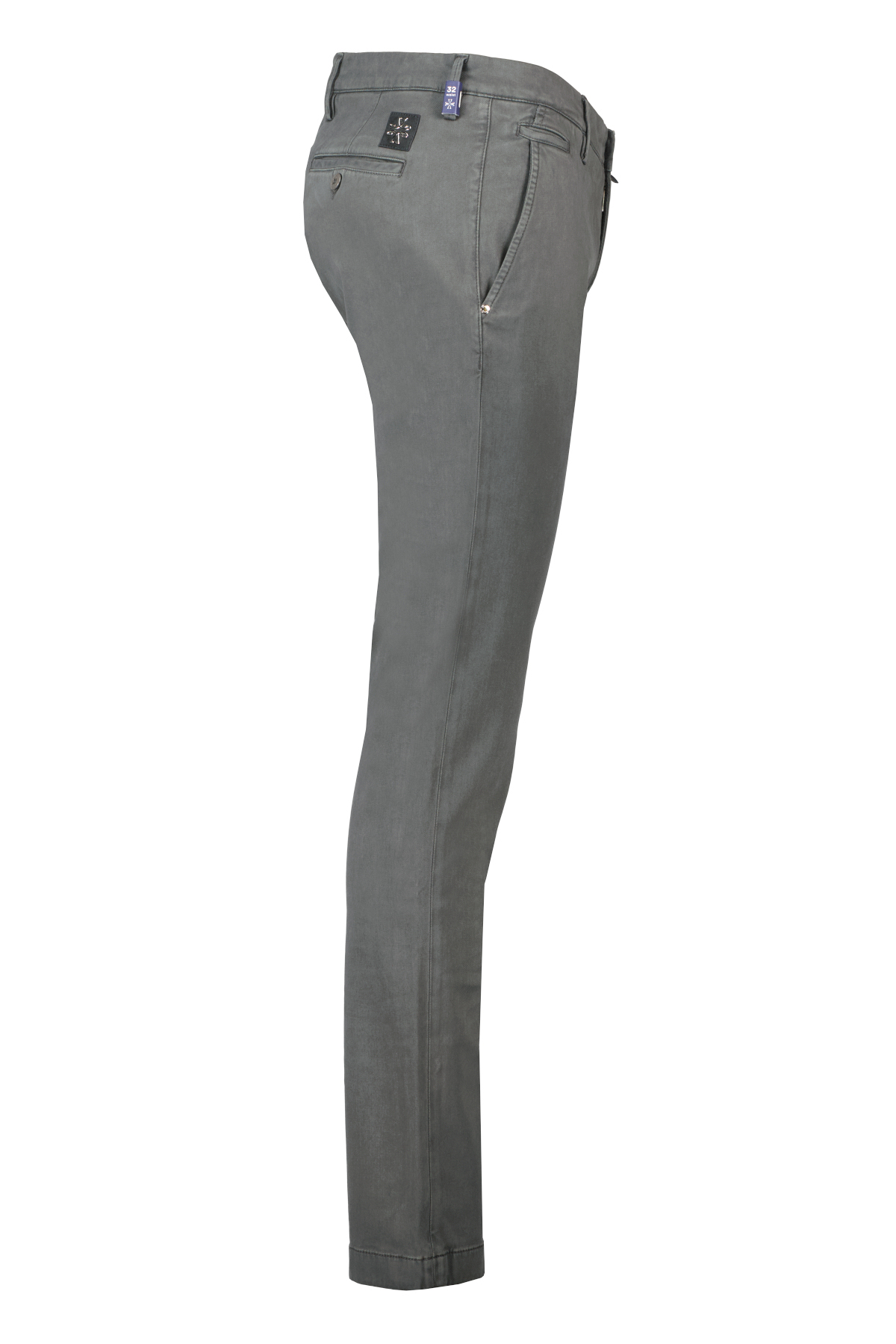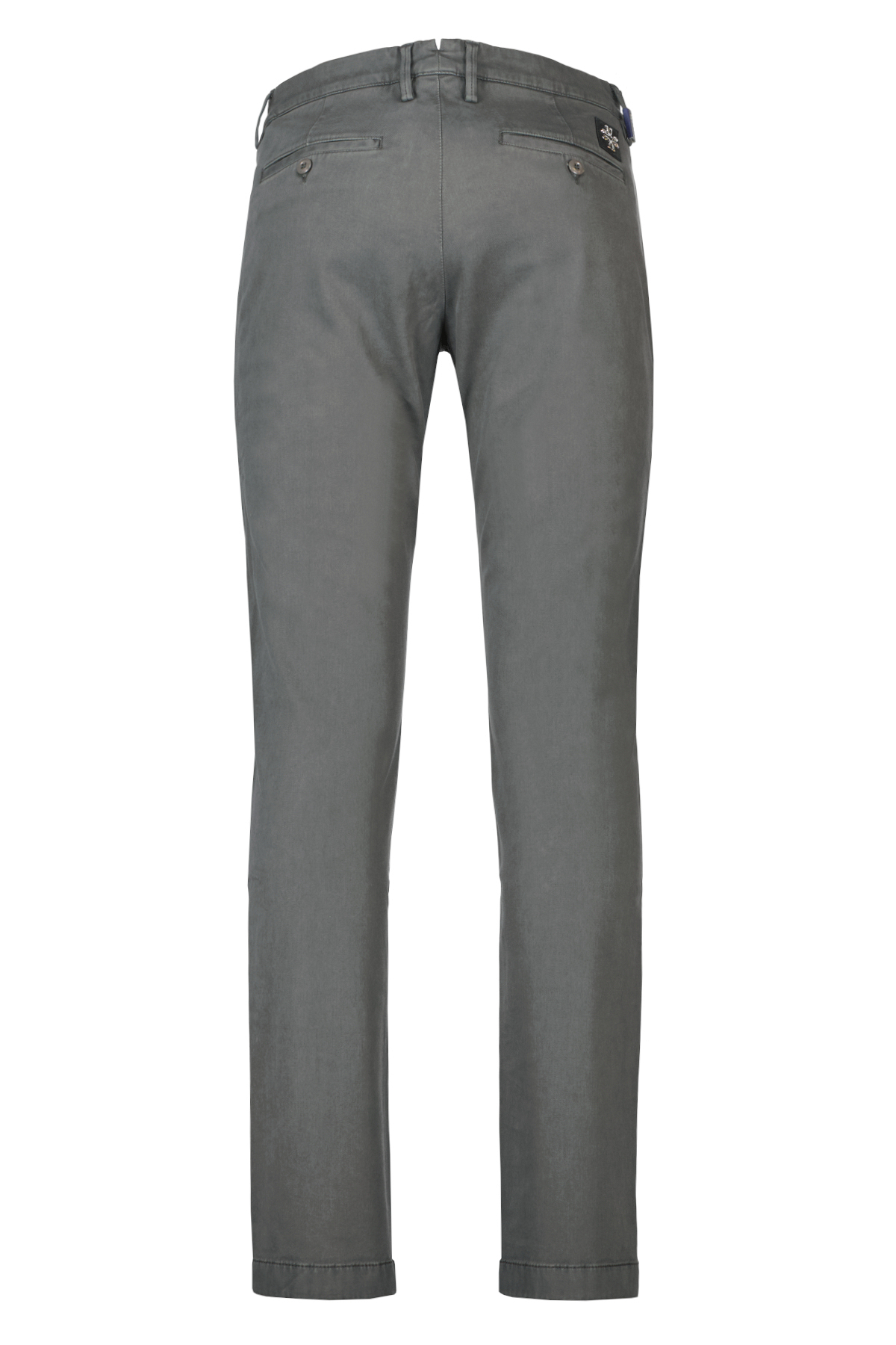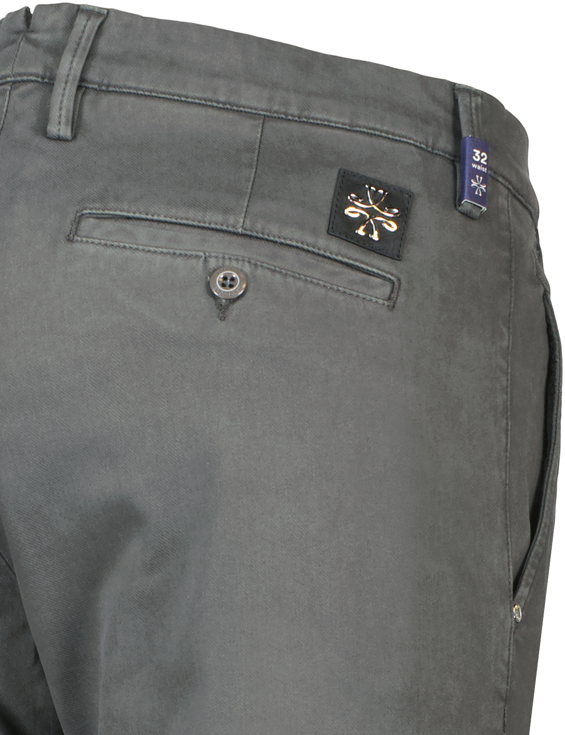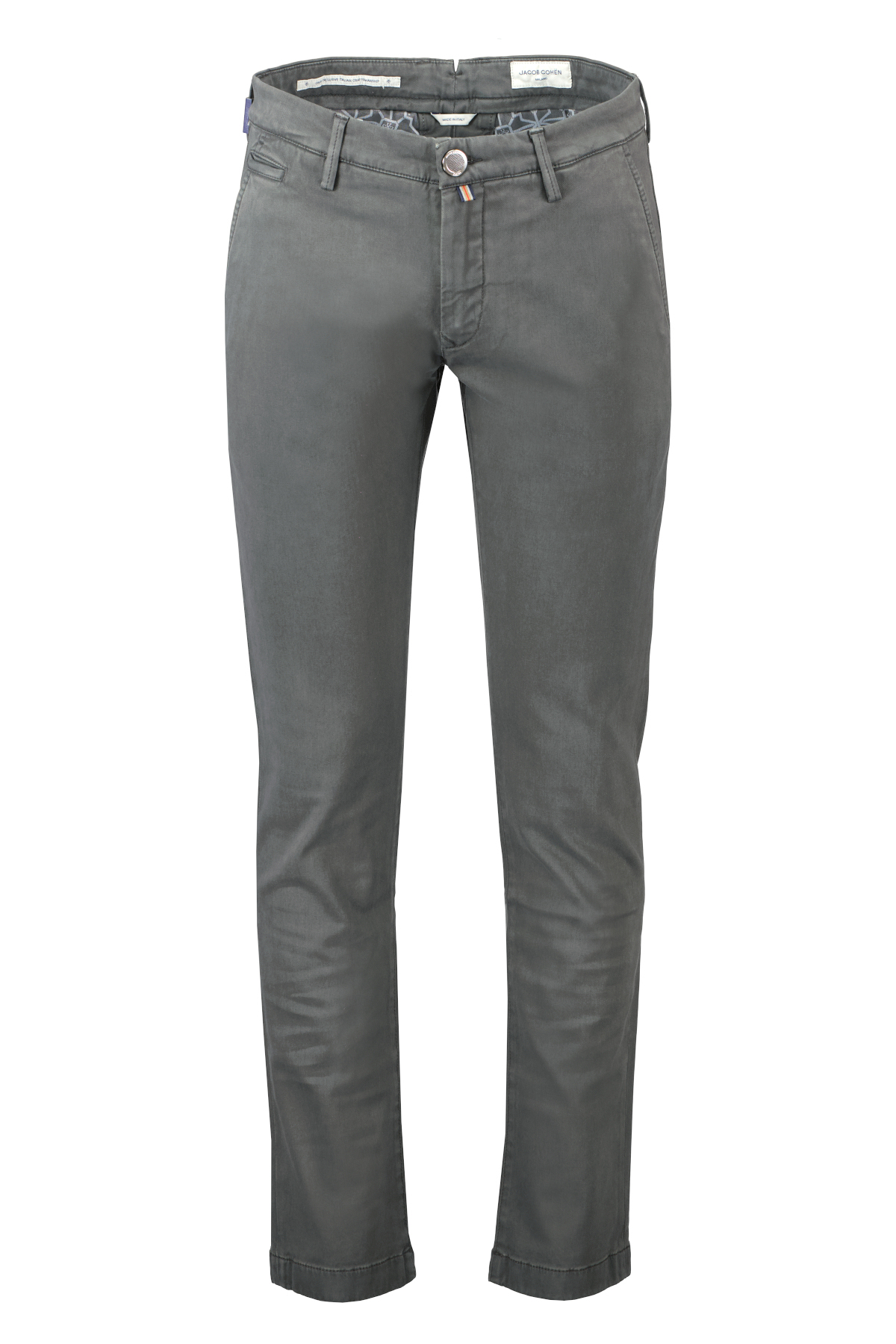 Donkergrijze broek model Bobby van Jacob Cohen. De Bobby is gemaakt van gabardine stretchkatoen, is een low rise model, heeft riemlussen, schuine zakken aan de zijkanten, een kleine paspelzak op de heup, paspelzakken achter met knoopsluiting, een knoop- en ritssluiting, een knoop met rutheniumafwerking, logo en ton-sur-ton geëmailleerd detail. Daarnaast is de broek geborduurd met de stijlnaam en het citaat van de oprichter op de interne sluiting, heeft een vierkante patch van suède aan de achterkant met metalen logoplaat en is geparfumeerd met de kenmerkende Jacob Cohën-geur.