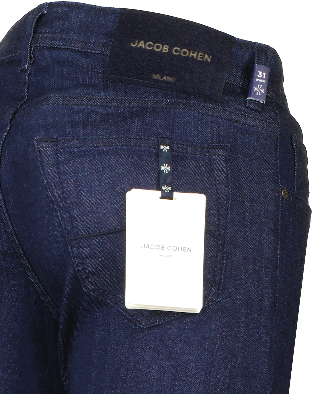 Donkerblauwe jeans voor heren model Bard van Jacob Cohën. De Bard is een 5-pocket jeans met een regular-slim fit en normale taillehoogte gemaakt van blauwe zachte stretchdenim van katoen en lyocell, enzyme washed en voorzien van kreukels, scheuren en schuurplekken voor een zacht gevoel. De jeans heeft een kalfshaar patch op de achterkant met logo in contrasterende kleur en een knoop met logo. Inclusief een bedrukte bandana en een klosje garen. Geborduurd met de stijlnaam en een quote van de oprichter op de binnensluiting, geborduurd logo op de vijfde zak. Geparfumeerd met de kenmerkende Jacob Cohën-geur.