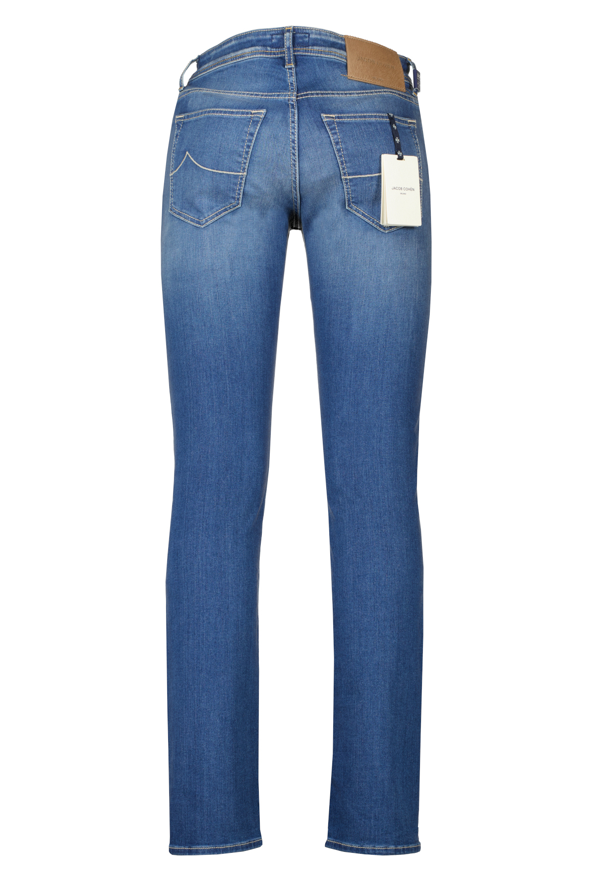 Blauwe jeans model Nick van Jacob Cohën. Gemaakt van blauwe stretchstof, gewassen met enzymen en gedetailleerd met subtiele schaafwonden, met een zachte textuur. Vijfpocketmodel met logoborduursel op het muntzakje. Heeft riemlussen, een knoopsluiting aan de voorkant en een unieke knop met rond ontwerp en 3D-logo. Daarnaast is de broek geborduurd met de stijlnaam en een citaat van de oprichter op de interne sluiting, een achterpatch van kalfshaar met geborduurd logo. Inclusief een bandana met logoprint en een klos garen. Geparfumeerd met de kenmerkende Jacob Cohën-geur.