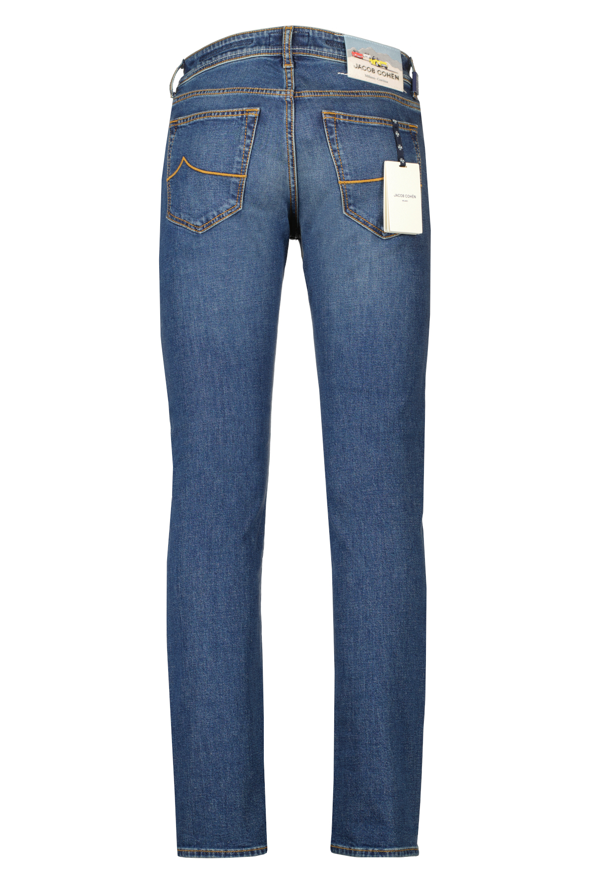 Blauwe jeans model Nick van Jacob Cohën. Gemaakt van blauwe stretchstof, gewassen met enzymen en gedetailleerd met subtiele schaafwonden, met een zachte textuur. Vijfpocketmodel met logoborduursel op het muntzakje. Heeft riemlussen, een knoopsluiting aan de voorkant en een unieke knop met rond ontwerp en 3D-logo. Daarnaast is de broek geborduurd met de stijlnaam en een citaat van de oprichter op de interne sluiting, een achterpatch van kalfshaar met metalen logoplaat. Inclusief een bandana met logoprint en een klos garen. Geparfumeerd met de kenmerkende Jacob Cohën-geur.