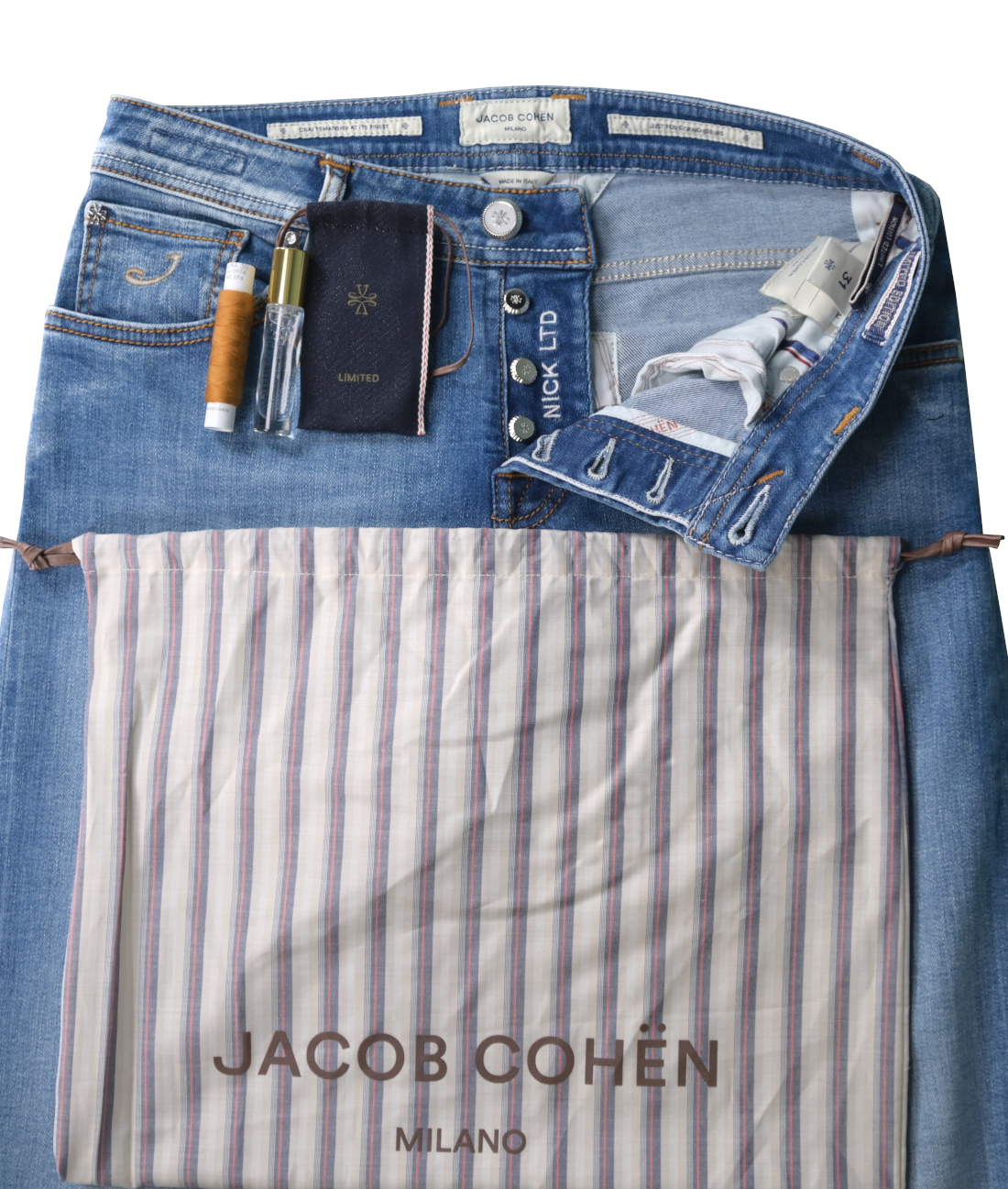 Blauwe limited edition broek voor heren model Nick van Jacob Cohën. Katoen-Stretch kwaliteit, gewassen met enzymen en gedetailleerd met subtiele schaafwonden, met een zachte textuur. Vijfpocketmodel met logoborduursel op het muntzakje. Heeft riemlussen, een knoopsluiting aan de voorkant en een geëmailleerde knop met rond ontwerp en 3D-logo. Daarnaast is de broek geborduurd met de stijlnaam en een citaat van de oprichter op de interne sluiting, een achterpatch van kalfshaar met logo en oplage in metalen patch. Inclusief een bandana met logoprint, parfum en een klos garen. Geparfumeerd met de kenmerkende Jacob Cohën-geur.