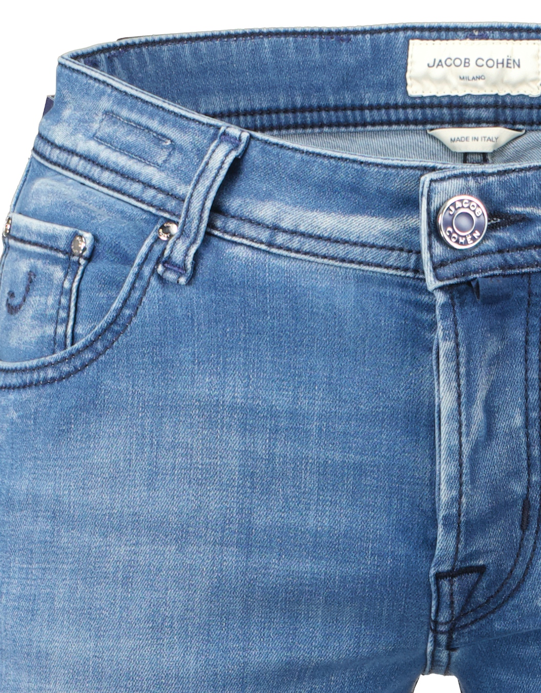 Blauwe jeans voor heren model Nick Slim van Jacob Cohën. Gemaakt van lichte stretch katoenen denim, gewassen met enzymen en met de hand geschuurd voor een zacht gevoel. Deze broek met vijf zakken en logoborduursel op het muntzakje is een low rise, heeft een knoopsluiting aan de voorkant met logoknoop, is geborduurd met de stijlnaam en het citaat van de oprichter op de interne sluiting, heeft een achterpatch van paars suède en geprint logo. Inclusief een bandana en een klosje garen. Geparfumeerd met de kenmerkende Jacob Cohën-geur.