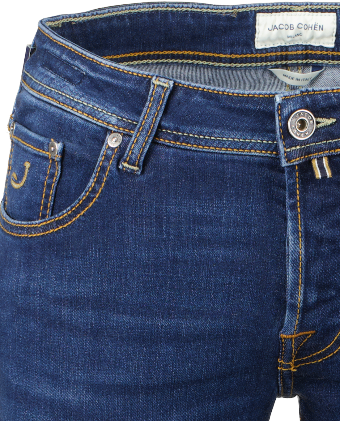 Donkerblauwe jeans voor heren model Nick Slim van Jacob Cohën. Gemaakt van lichte stretch katoenen denim, gewassen met enzymen en met de hand geschuurd voor een zacht gevoel. Deze broek met vijf zakken en logoborduursel op het muntzakje is een low rise, heeft een knoopsluiting aan de voorkant met logoknoop, is geborduurd met de stijlnaam en het citaat van de oprichter op de interne sluiting, heeft een achterpatch van bruin suède en geborduurd logo. Inclusief een bandana en een klosje garen. Geparfumeerd met de kenmerkende Jacob Cohën-geur.