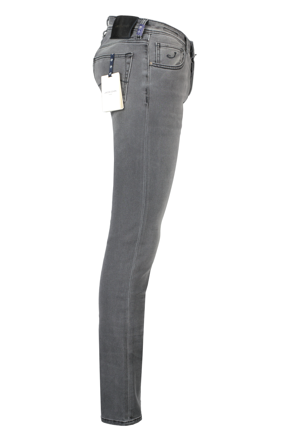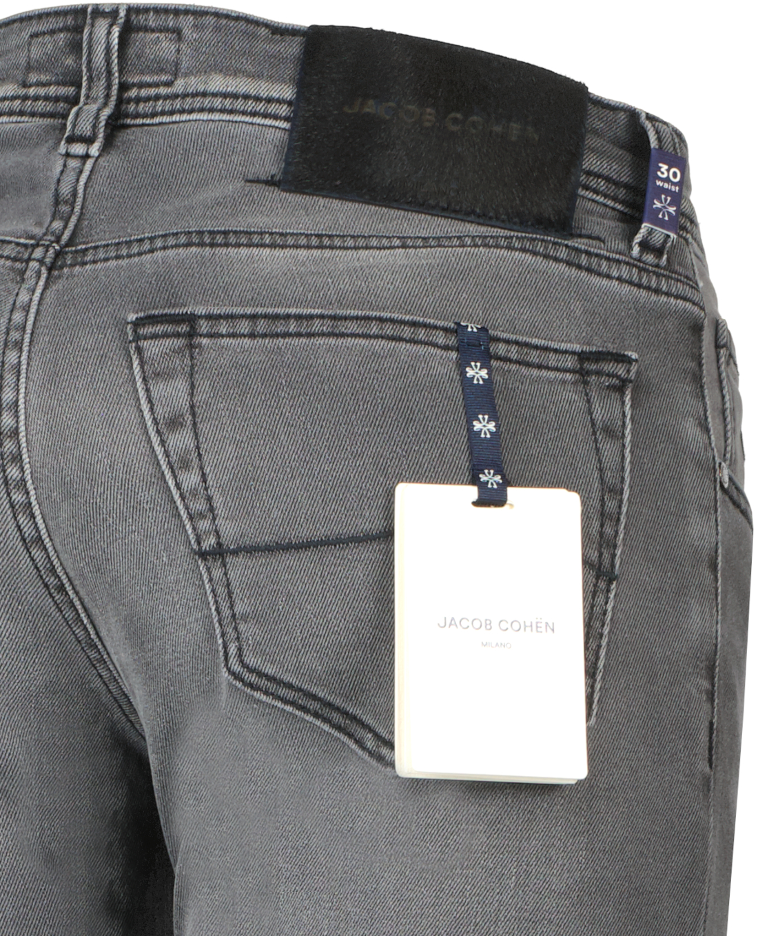 Grijze jeans model Nick van Jacob Cohën. Gemaakt van blauwe stretchstof, gewassen met enzymen en gedetailleerd met subtiele schaafwonden, met een zachte textuur. Vijfpocketmodel met logoborduursel op het muntzakje. Heeft riemlussen, een knoopsluiting aan de voorkant en een unieke knop met rond ontwerp en 3D-logo. Daarnaast is de broek geborduurd met de stijlnaam en een citaat van de oprichter op de interne sluiting, een achterpatch van kalfshaar met geborduurd logo. Inclusief een bandana met logoprint en een klos garen. Geparfumeerd met de kenmerkende Jacob Cohën-geur.