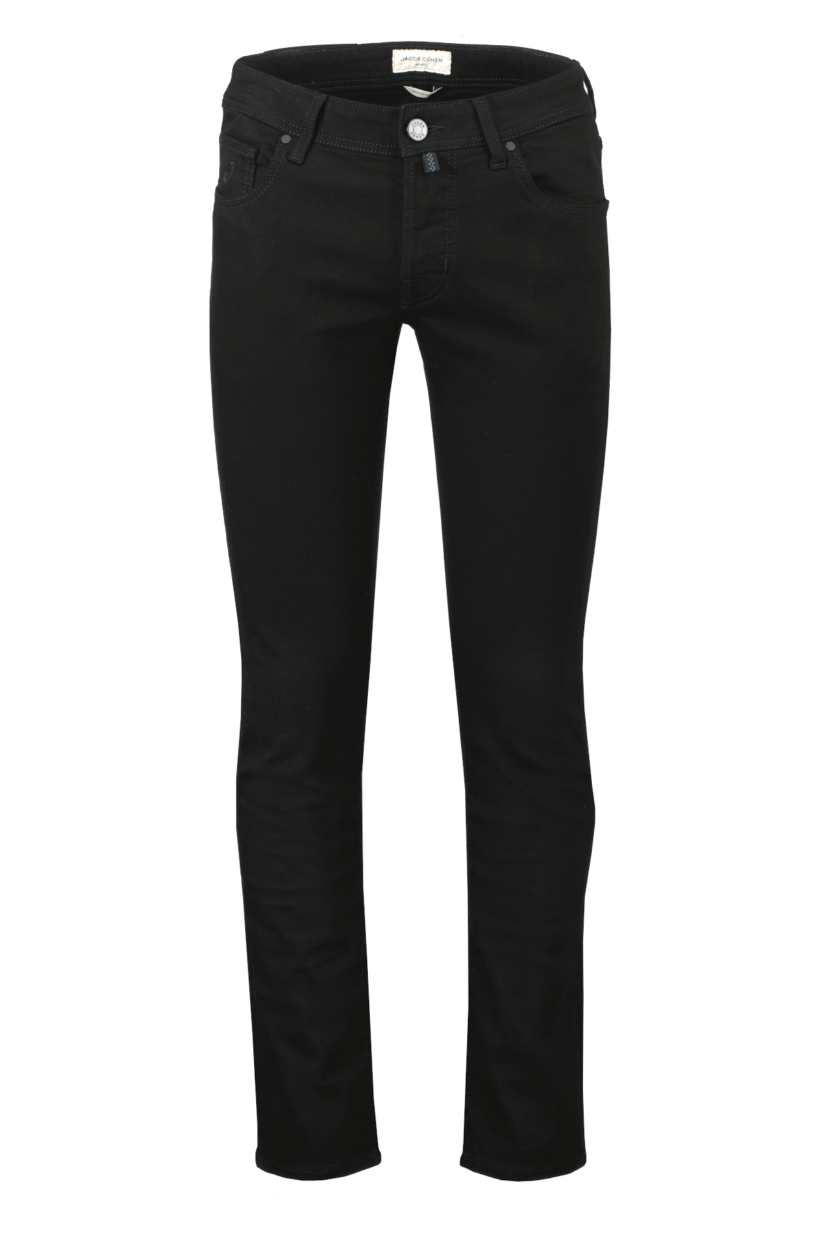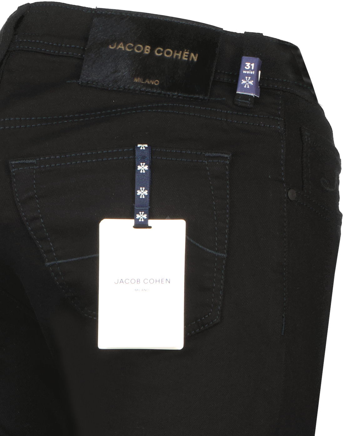 Zwarte jeans model Nick van Jacob Cohën. Gemaakt van lichte stretchstof, gewassen met enzymen en gedetailleerd met subtiele schaafwonden, met een zachte textuur. Vijfpocketmodel met logoborduursel op het muntzakje. Heeft riemlussen, een knoopsluiting aan de voorkant en een unieke knop met rond ontwerp en 3D-logo. Daarnaast is de broek geborduurd met de stijlnaam en een citaat van de oprichter op de interne sluiting, een achterpatch van kalfshaar met geprint logo. Inclusief een bandana met logoprint en een klos garen. Geparfumeerd met de kenmerkende Jacob Cohën-geur.