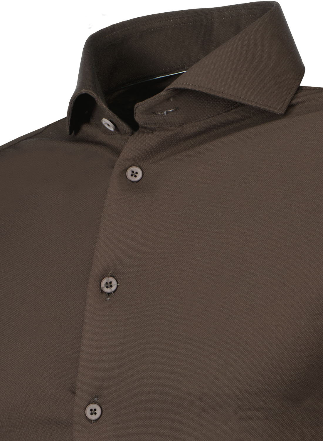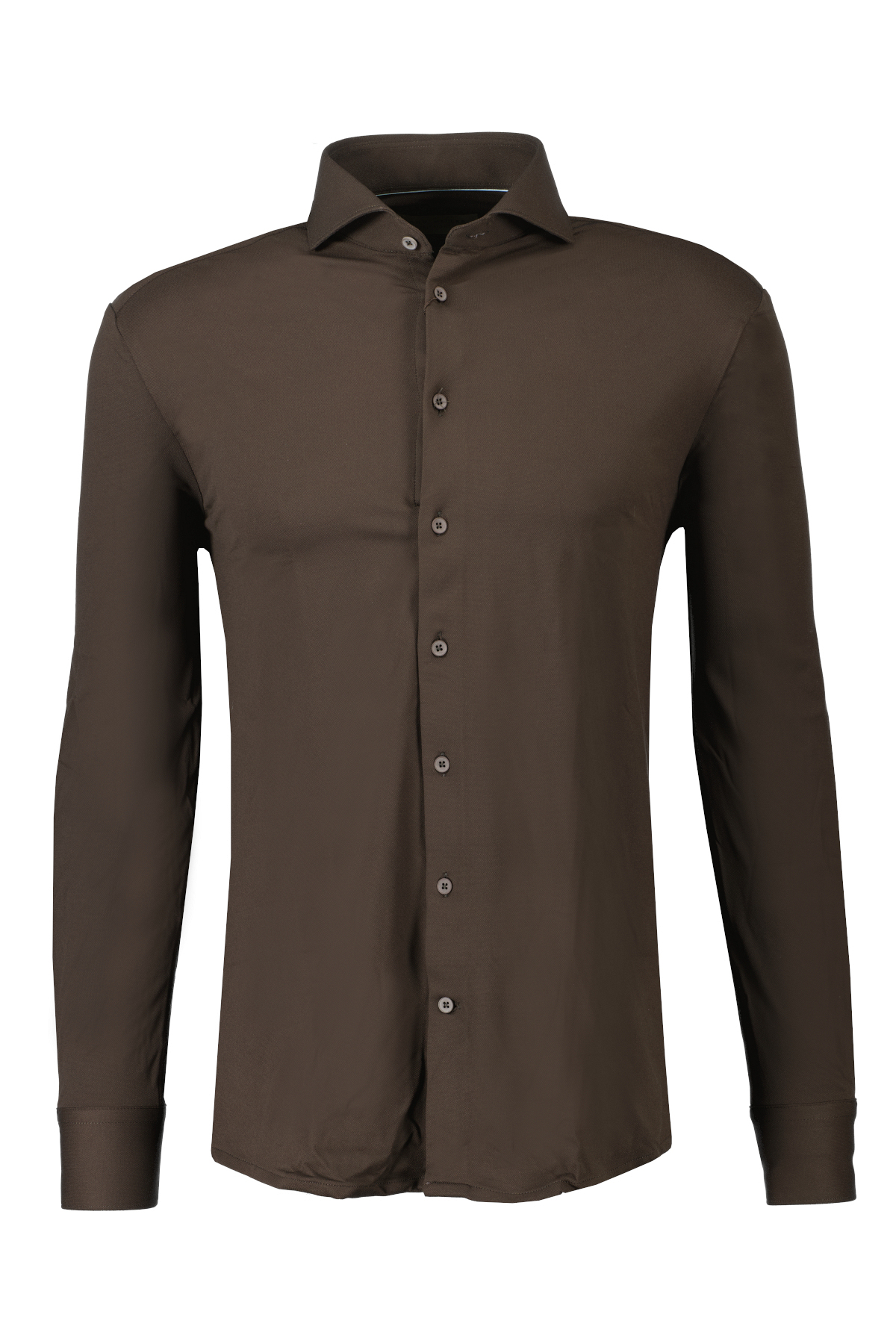 Bruin overhemd voor heren van John Miller met een tailored fit. De minimalistische ton sur ton uitwerking van het doek creëert in combinatie met de moderne cutaway boord een jonge, stijlvolle look. Uitgevoerd in een mooi en comfortabele hyperstretch kwaliteit.