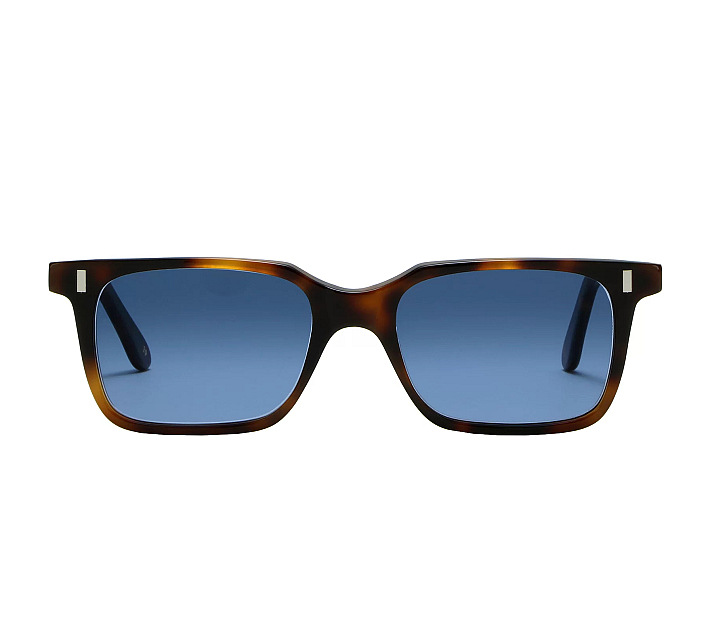 Zonnebril met bruin havana montuur en blauwe glazen model Suez van L.G.R. Suez is een iconisch silhouet, geïnspireerd door het perfectionisme van Zwitserse architecten. Met twee klinknagels die met de hand zijn vastgehamerd en gepolijst.