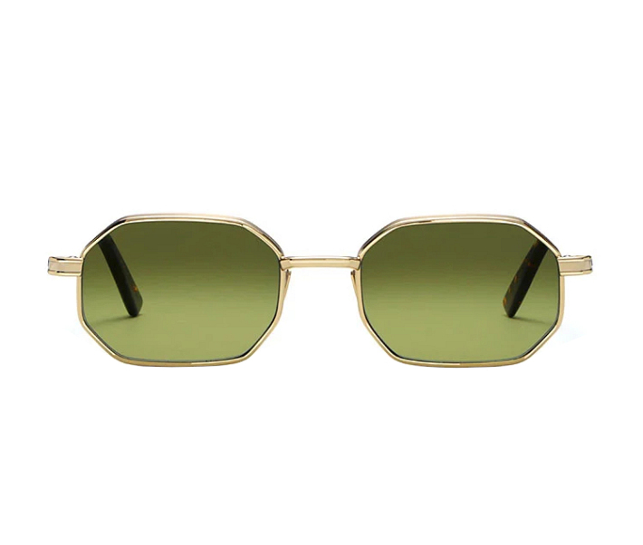Zonnebril met gouden montuur en groen meekleurende glazen model Axum van L.G.R. De Axum is een hexagonaal model dat een essentiële vorm combineert met ongeëvenaarde structurele verfijning. Het montuur biedt een perfecte balans tussen de robuustheid van metaal en de delicatesse van acetaatveren. Dit model heeft een dikke geribbelde metalen profiel en verstelbare metalen neuspads.