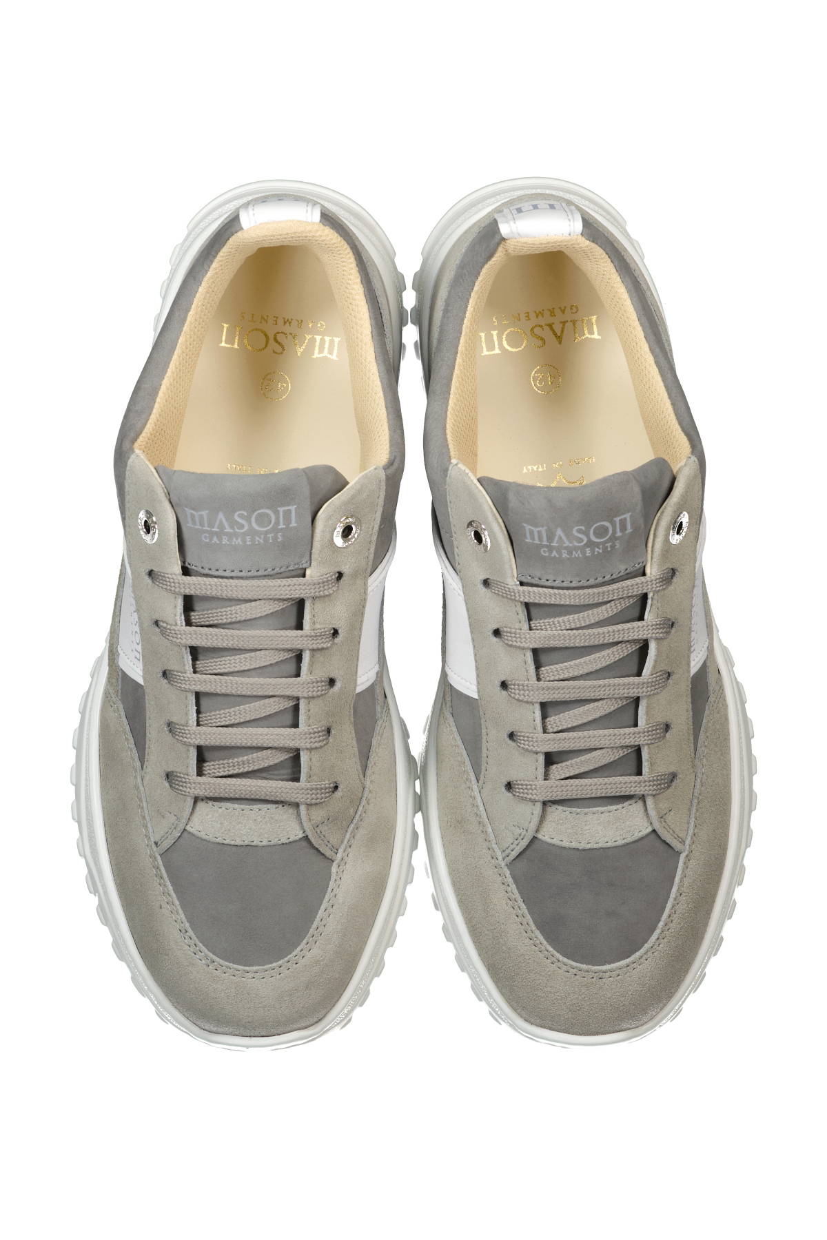Grijs met witte schoenen model Tia Runner van Mason Garments. Deze geavanceerde versie van de iconische Tia Sneaker legt de nadruk op prestaties met een licht, ademend bovenwerk, heeft een strak design ondersteund door een ergonomisch schuimzool. De schoen heeft een op maat gemaakte rubberen buitenzool, zachte mesh binnenvoering en is gemaakt van duurzaam geproduceerde materialen. Handgemaakt in Italië.