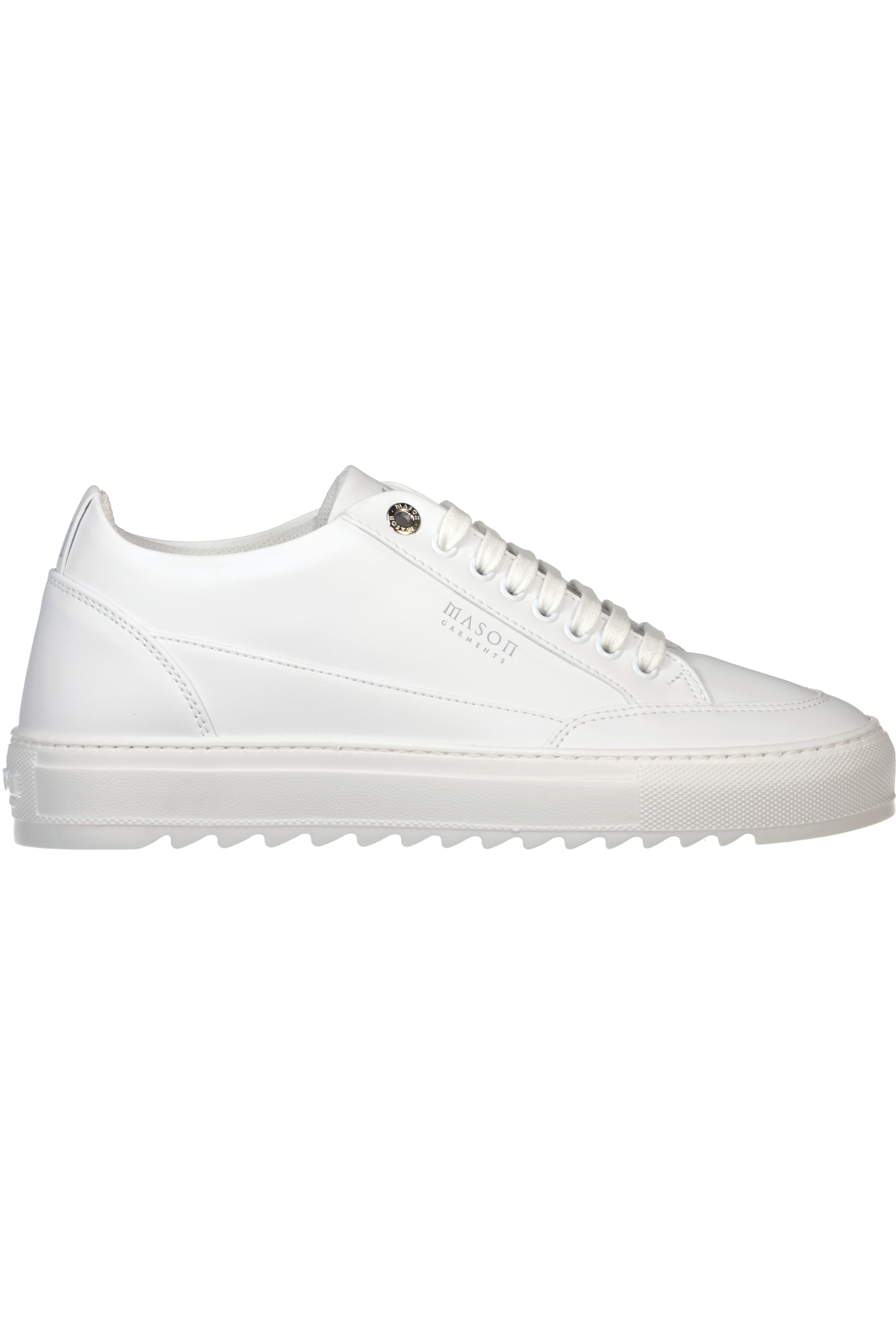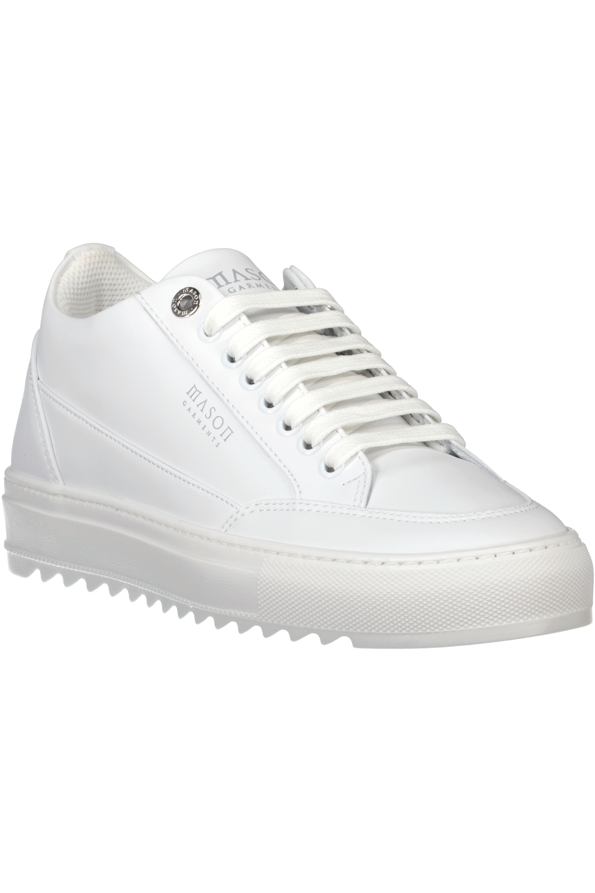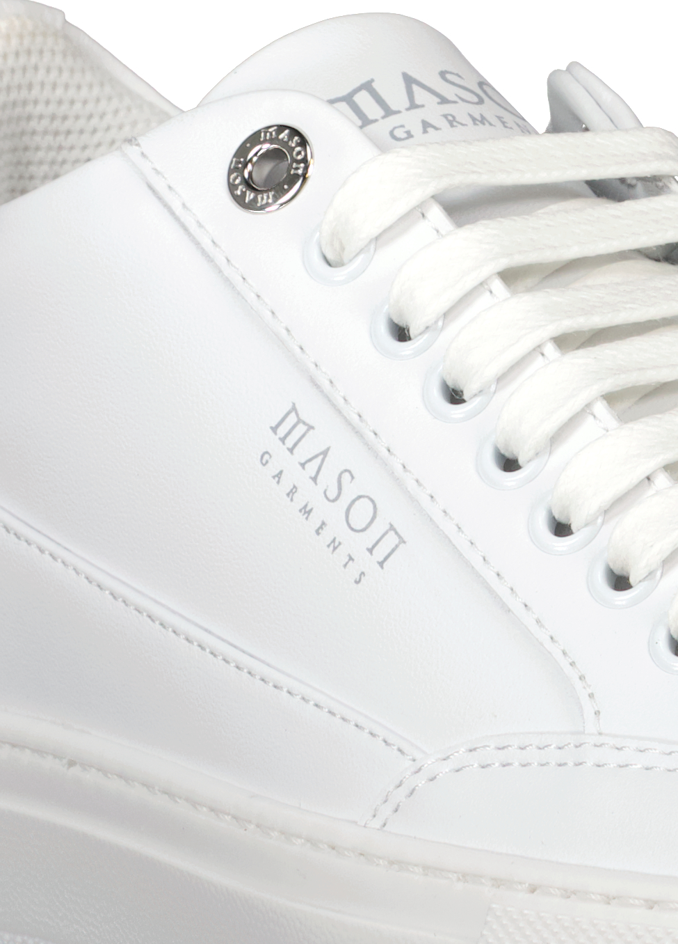 Wit op witte schoenen model Tia van Mason Garments. De Tia Nuovo is ontworpen met het doel om als een 'alledaagse' schoen te fungeren wat past bij meerdere outfits. De bovenconstructie is voorzien van het bekende sacchetto, dat voornamelijk wordt gebruikt voor high-end modeschoenen. De binnenzool van schuim is bedekt met rundleer voor luxueus comfort en ondersteuning.