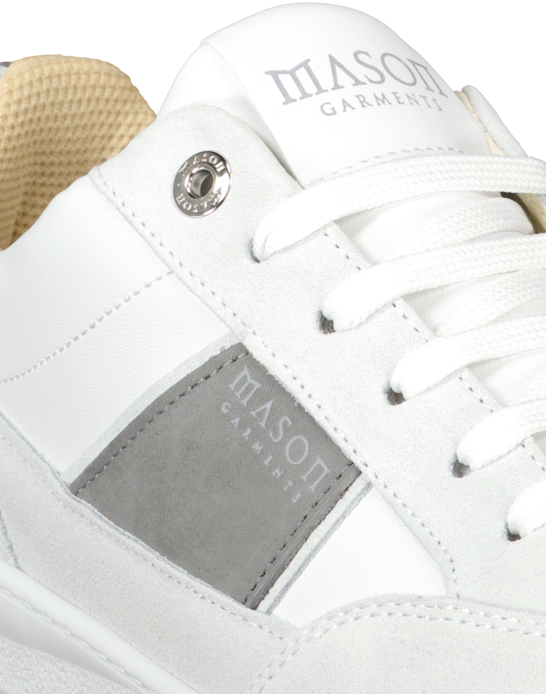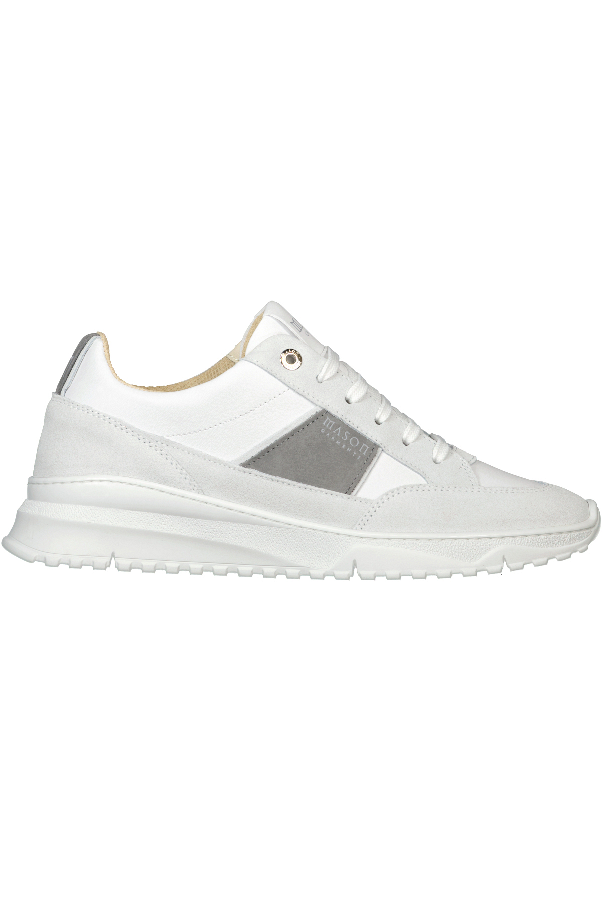 Wit met grijze schoenen model Tia Runner van Mason Garments. Deze geavanceerde versie van de iconische Tia Sneaker legt de nadruk op prestaties met een licht, ademend bovenwerk, heeft een strak design ondersteund door een ergonomisch schuimzool. De schoen heeft een op maat gemaakte rubberen buitenzool, zachte mesh binnenvoering en is gemaakt van duurzaam geproduceerde materialen. Handgemaakt in Italië.