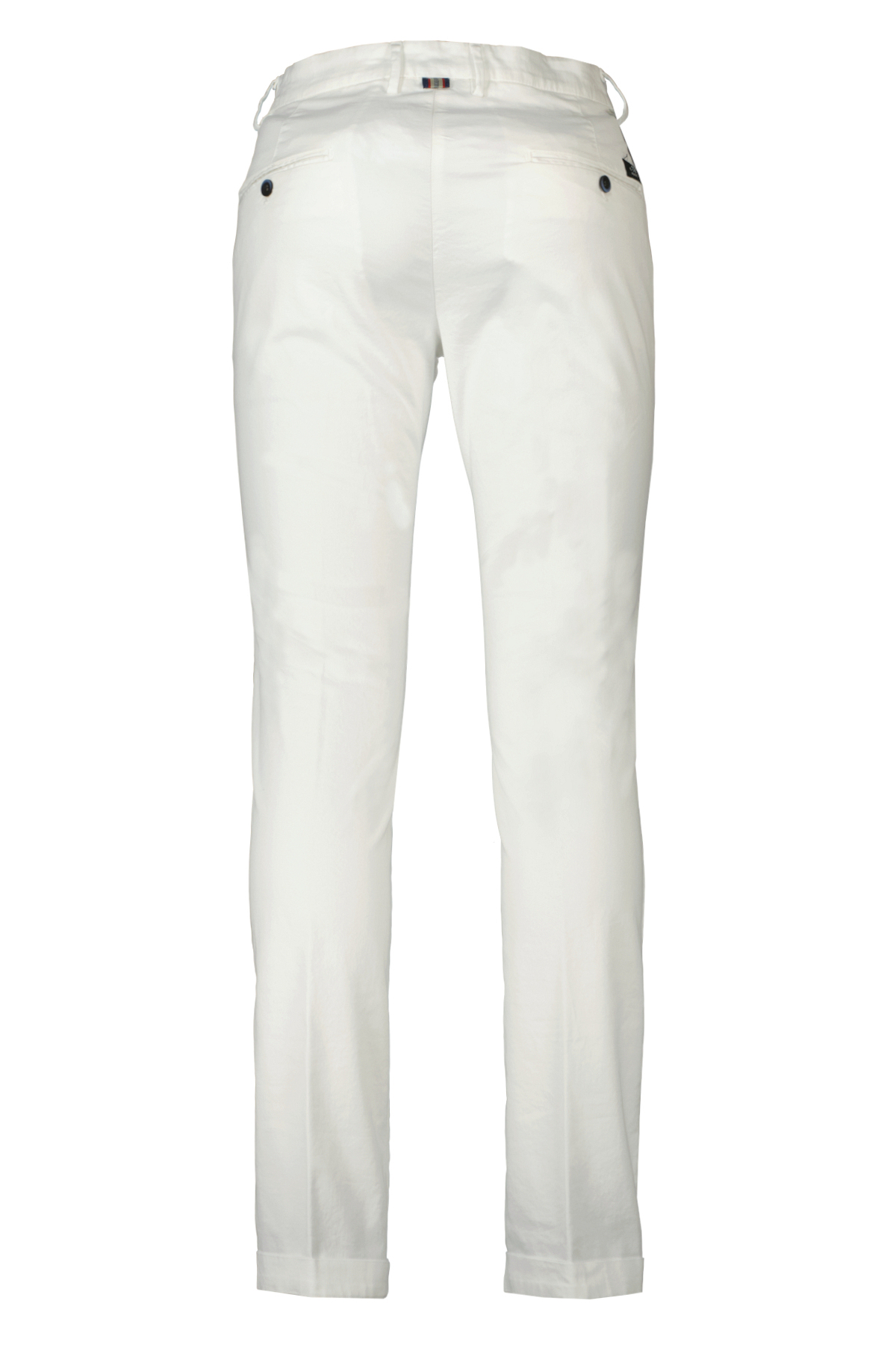 Witte chino model Torino van Mason's. De chino is gemaakt van tricot, een katoen- en lyocellstof waarbij frisheid en flexibiliteit voorop staat. De broek heeft een knoop- en ritssluiting, twee steekzakken, twee achterzakken met knoopsluiting en een subtiel logo boven de achterzak.
