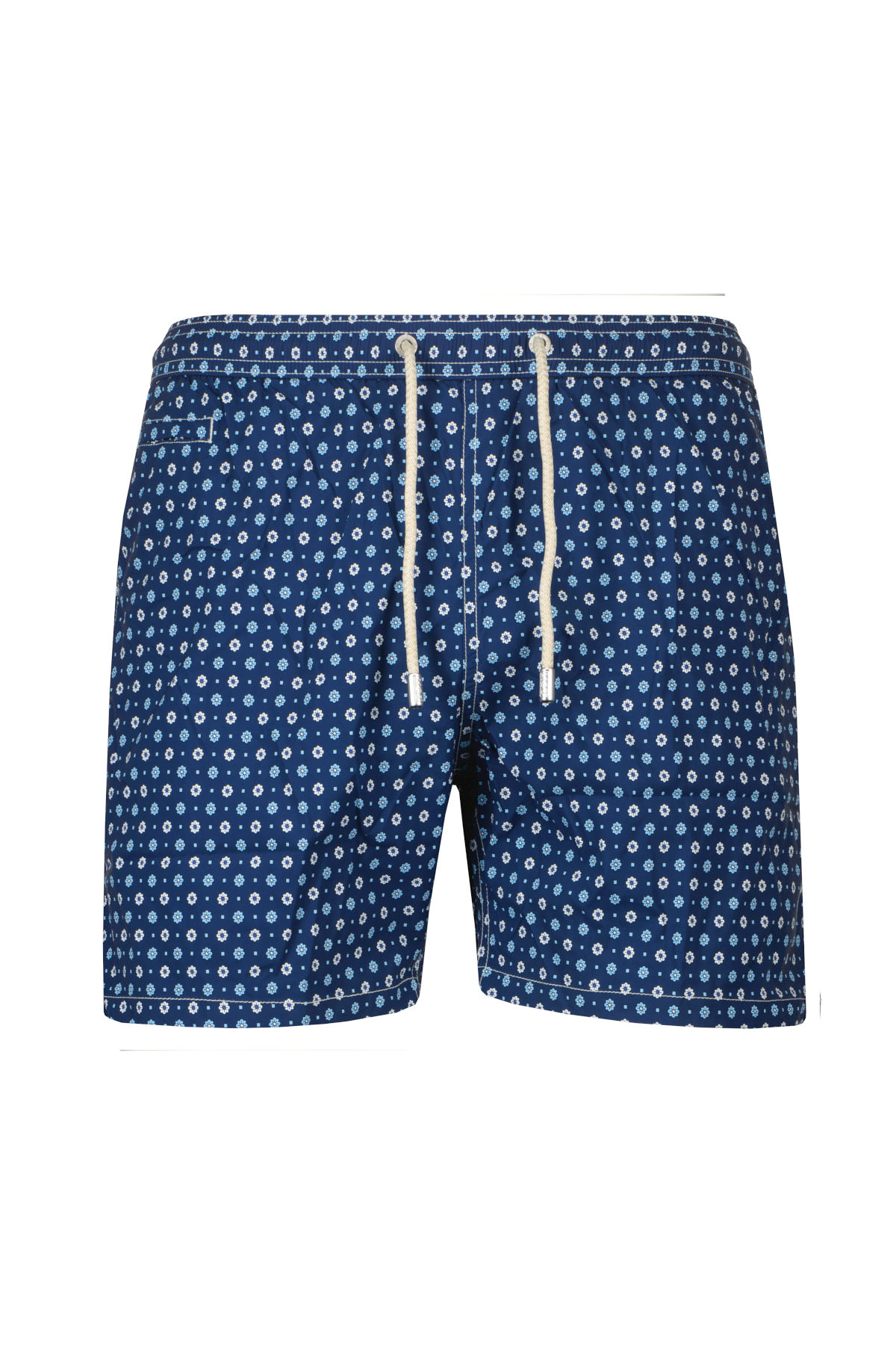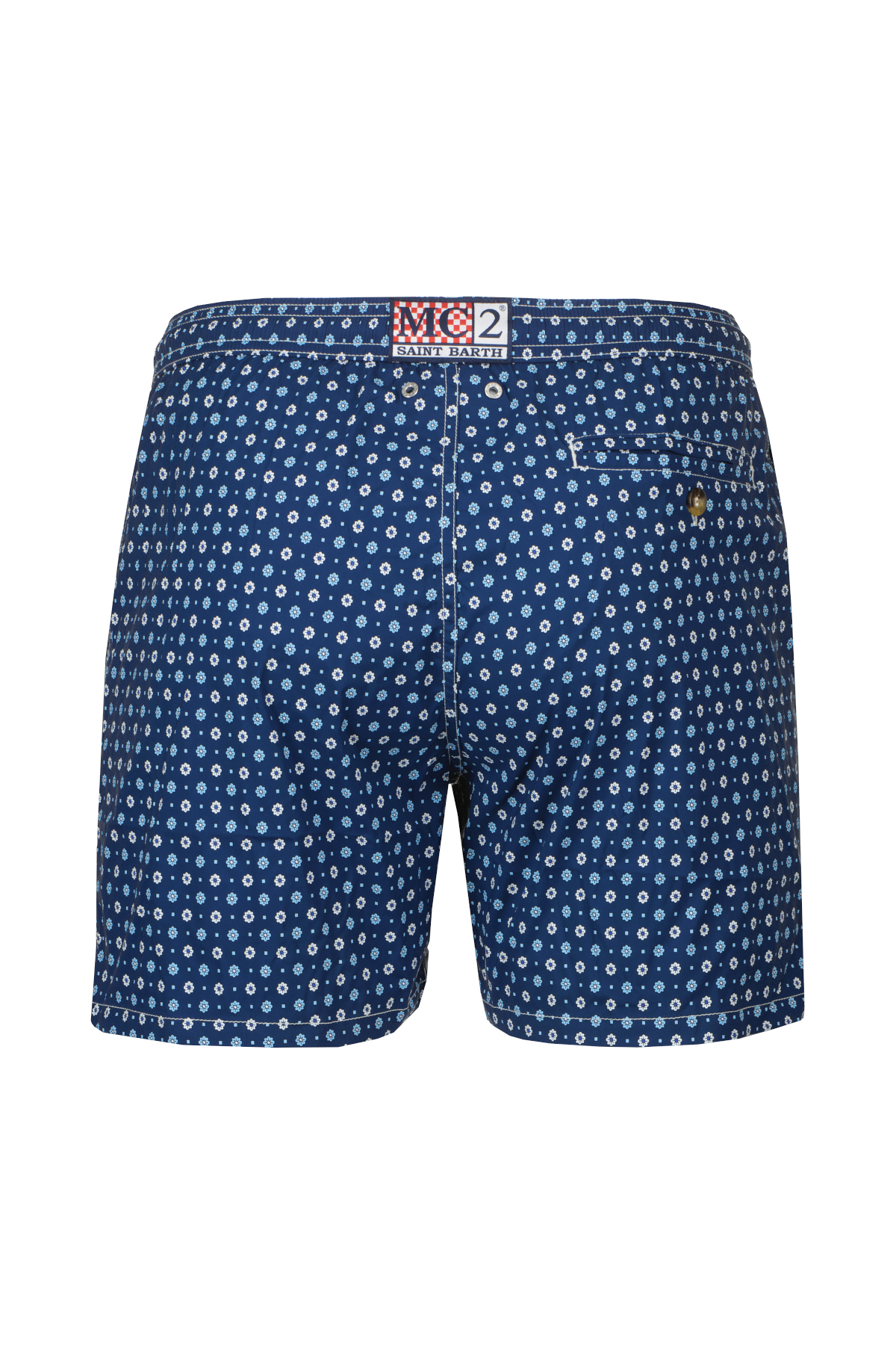 Blauwe zwemshort model Lighting met all-over patroon van MC2 Saint Barth. De Lighting is gemaakt van 100% gerecycled polyester, heeft twee streekzakken en een achterzak die te sluiten is met klittenband.