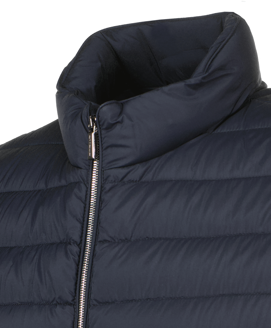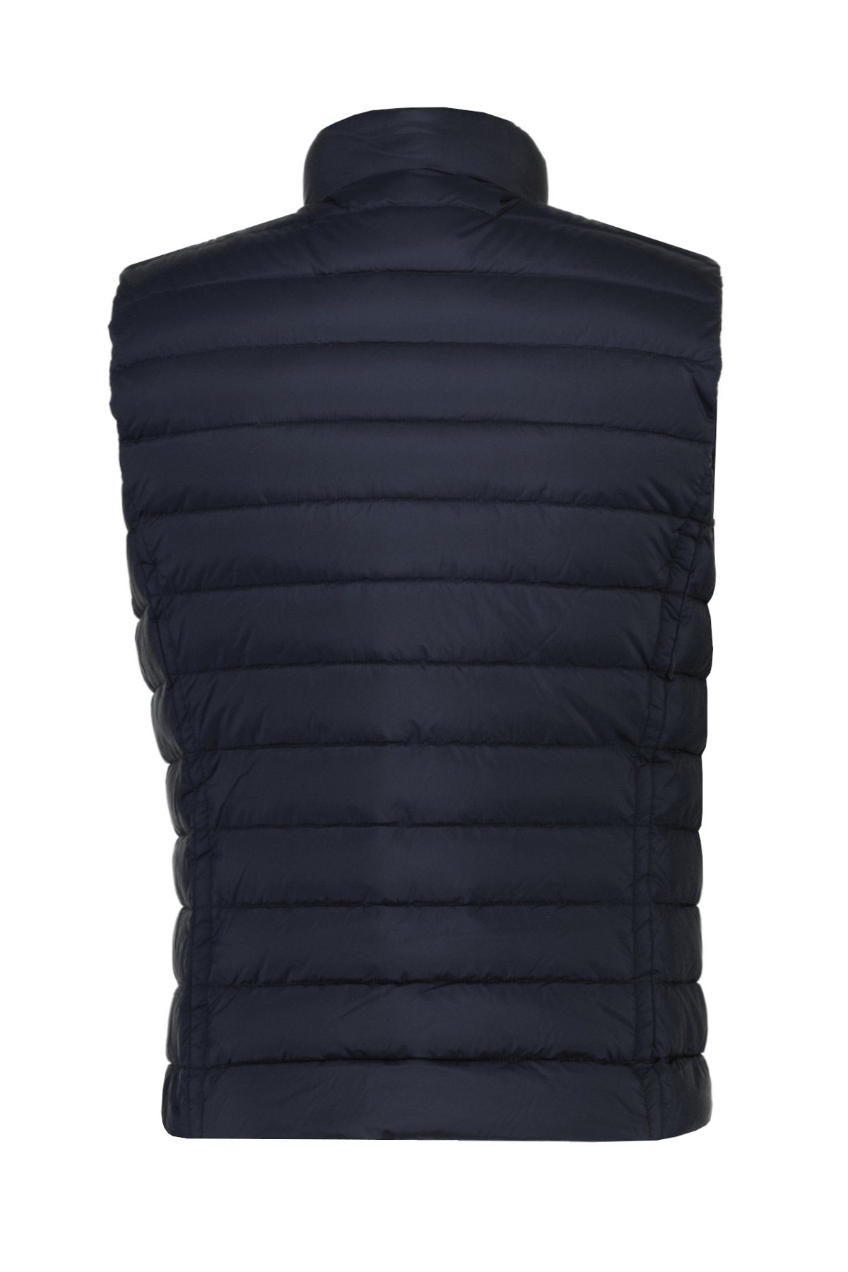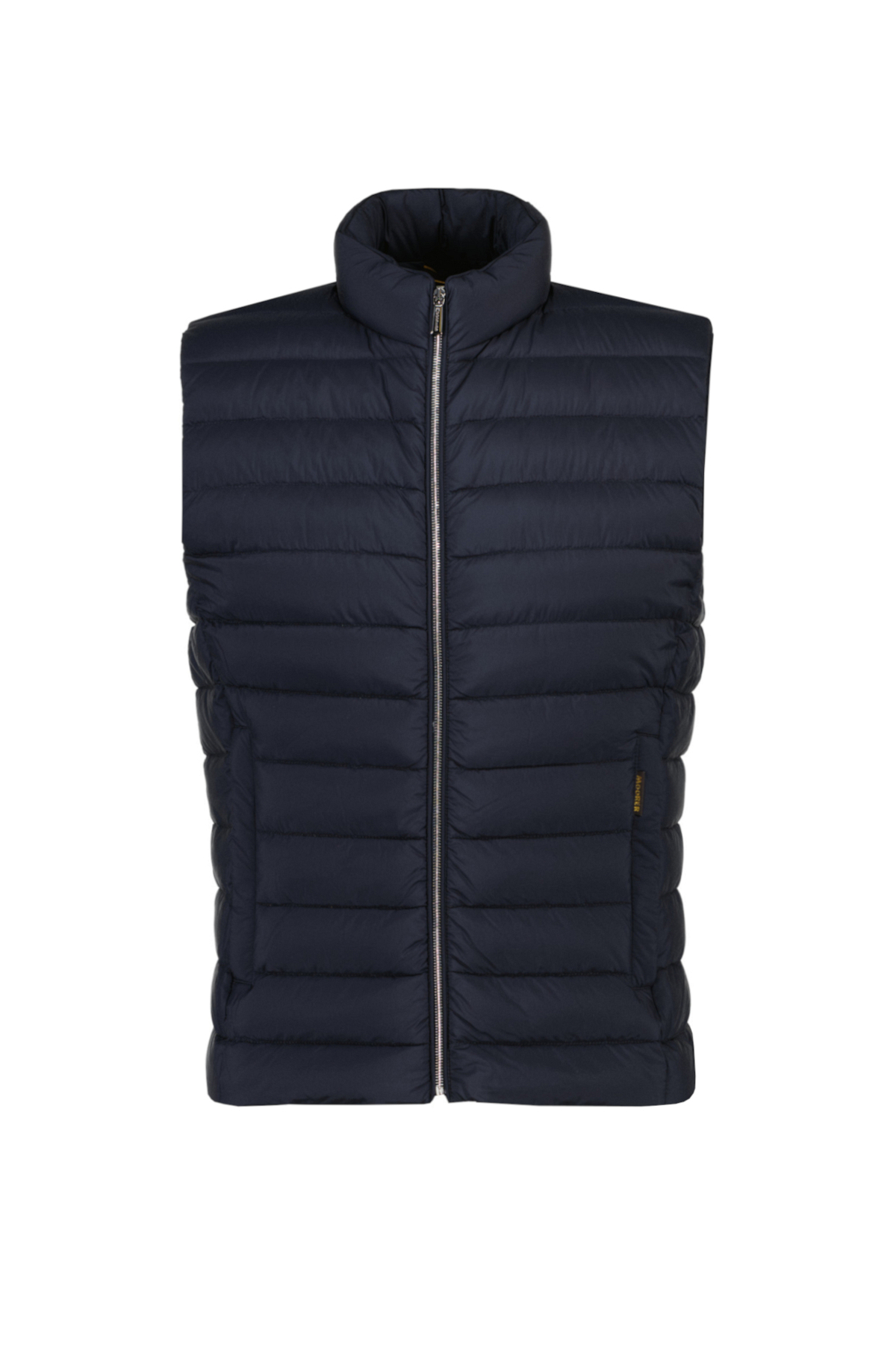 Donkerblauwe bodywarmer Calaf voor heren van Moorer. Boudin-gewatteerde bodywarmer opgevuld met ganzenveren. Voorsluiting met dubbele glijderrits van geborsteld metaal. Verticale paspelzakken met metalen ritsen aan de zijkanten. Handig binnenvak voor waardevolle spullen. Stofsamenstelling: ultralichtgewicht 20 denier matte donsbestendige stof (95%PA 5%PU), ontworpen voor het creëren van de lichtste donsgeïnjecteerde kledingstukken. De stof heeft een zijdeachtige uitstraling met een subtiel kreukeleffect wat uniek is voor dit artikel.