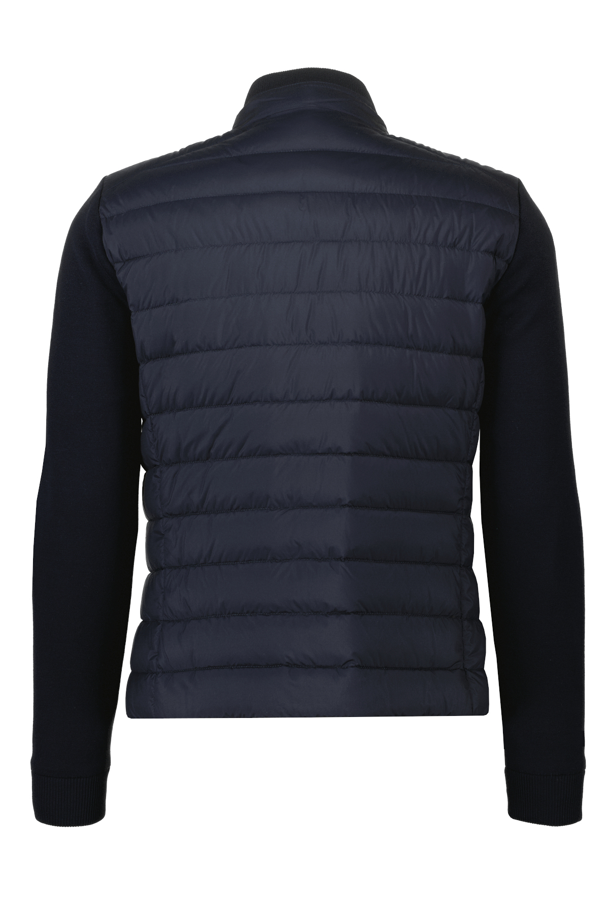 Donkerblauwe heren bomber jas Cattaneo van Moorer met een klein opstaande kraag. Het jack heeft een gewatteerde vulling, de mouwen en zoom zijn geribbeld afgewerkt, materiaal is van katoenmix. Verder is de jas voorzien van dubbele ritssluiting en heeft op de voorzijde twee zakken die ook sluitbaar zijn met een rits. De jas is kort van model en heeft een slim-fit.
